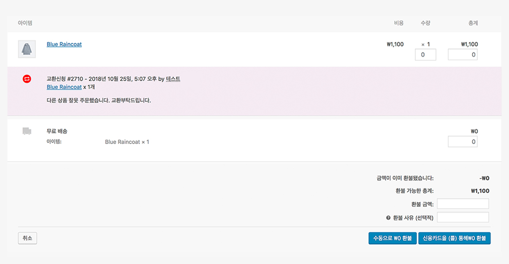 우커머스 주문처리 단계에는 교환 반품이 없어 해당 기능을 처리할 수 없지만,