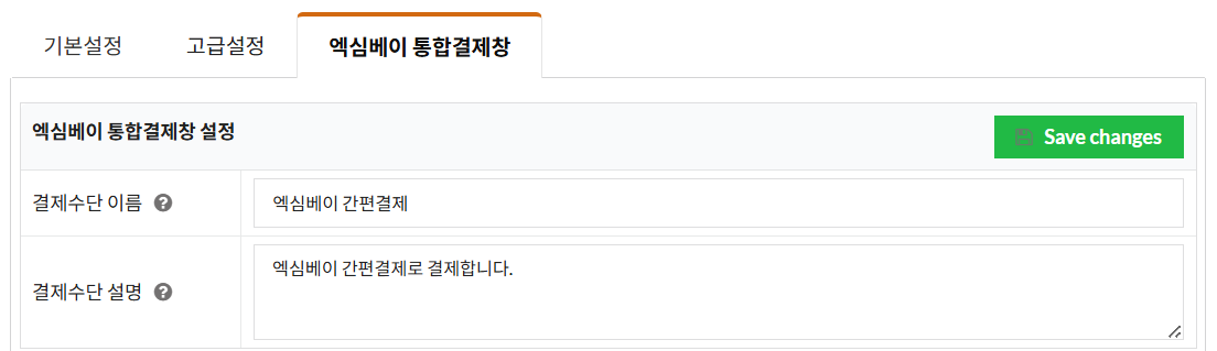 플러그인 설정 메뉴는 [심플페이 결제관리 > 결제설정 > 엑심베이 설정 > 통합결제창(탭)]입니다.