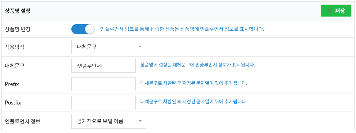 적용 방식을 대체문구로 선택할 경우 활성화되는 옵션으로 상품명에 설정된 대체문구에 인플루언서 정보가 표시됩니다. -