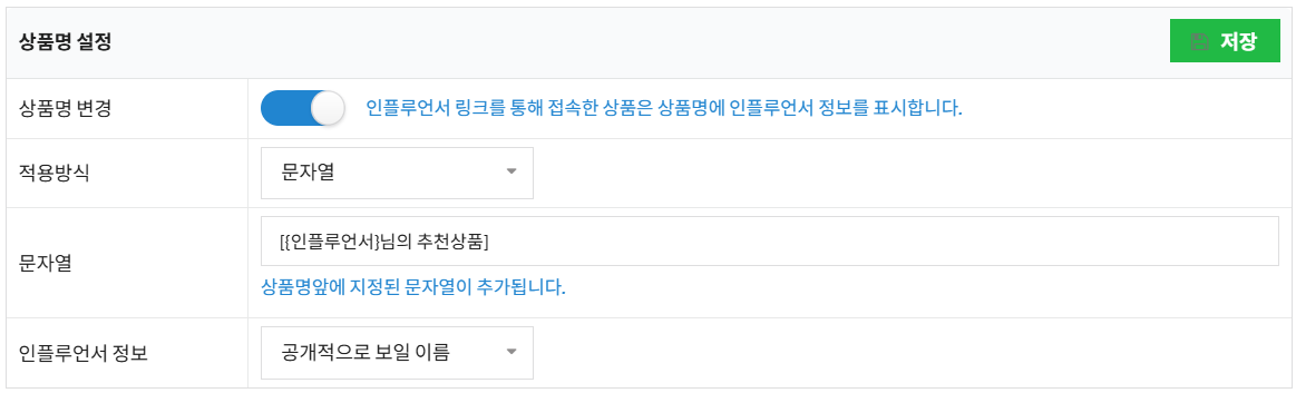인플루언서를 통해 접속한 상품의 상품명에 인플루언서 정보를 표시하려면 활성화 합니다.