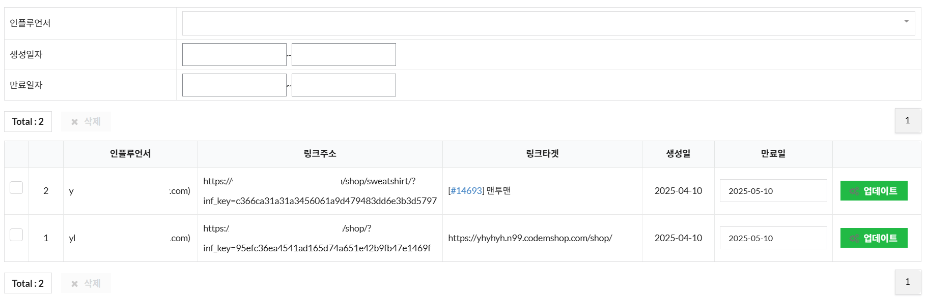 공유 링크를 생성한 인플루언서, 공유 링크 주소, 생성일, 만료일 등을 확인할 수 있으며, 만료일을 수정할 수 있습니다.