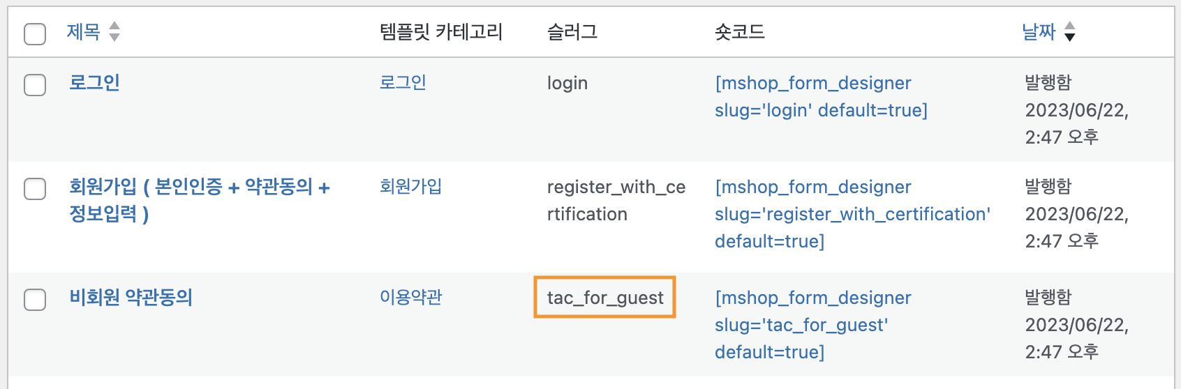 (주의) data-form 값은 비회원 약관동의 템플릿의 슬러그가 입력되어야 합니다.