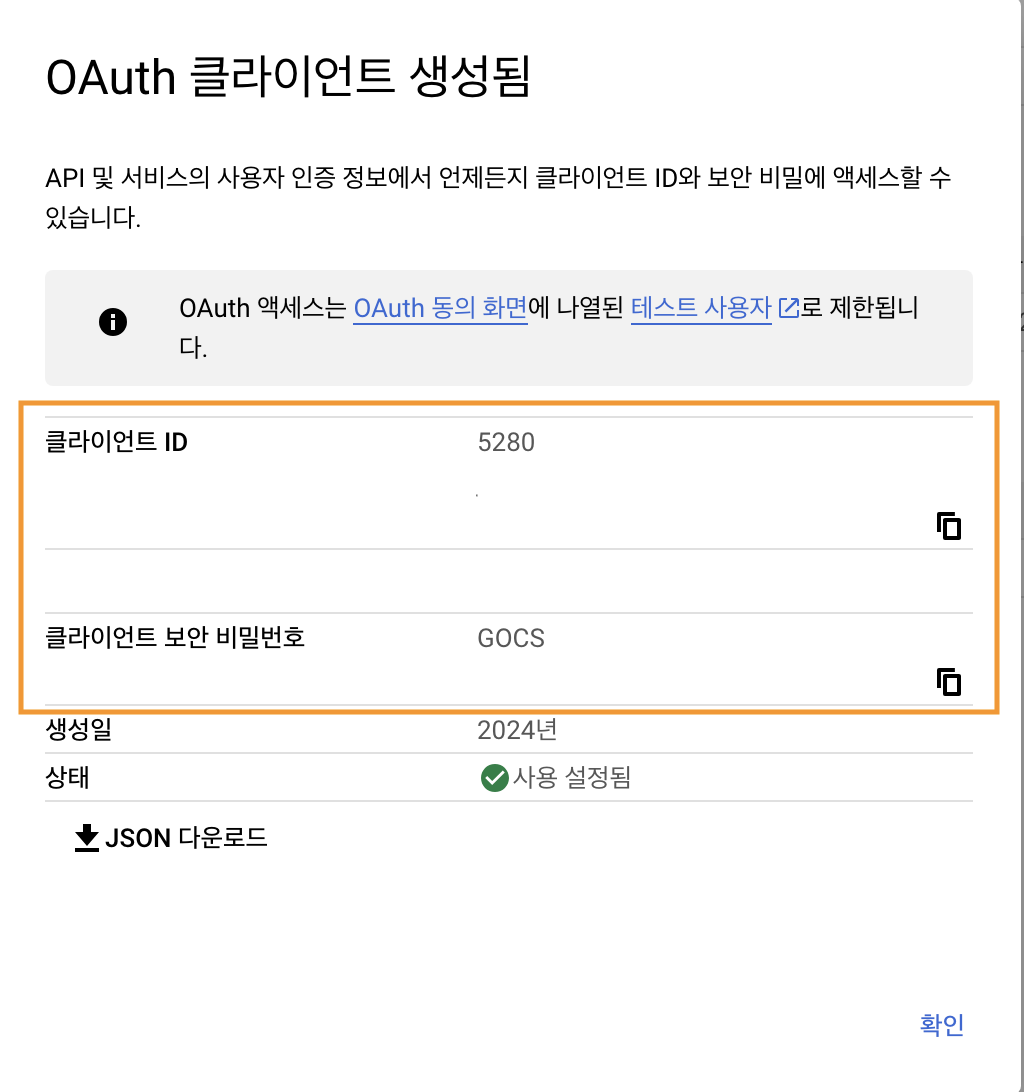 만들기 버튼 클릭 후 OAuth 클라이언트 ID가 생성되면 클라이언트 ID와 클라이언트 보안 비밀번호를 복사하여 소셜로그인 설정 > 소셜로그인 > 구글 (google)] 섹션의 클라이언트 ID와 클라이언트 시크릿 영역에 각각 붙여넣기 후 저장합니다.