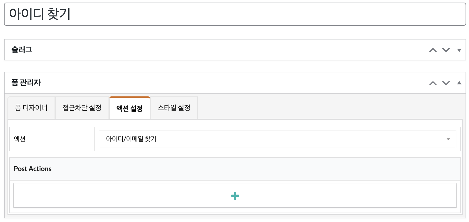 액션 설정 탭을 클릭하여 액션을 아이디/이메일 찾기로 변경합니다.