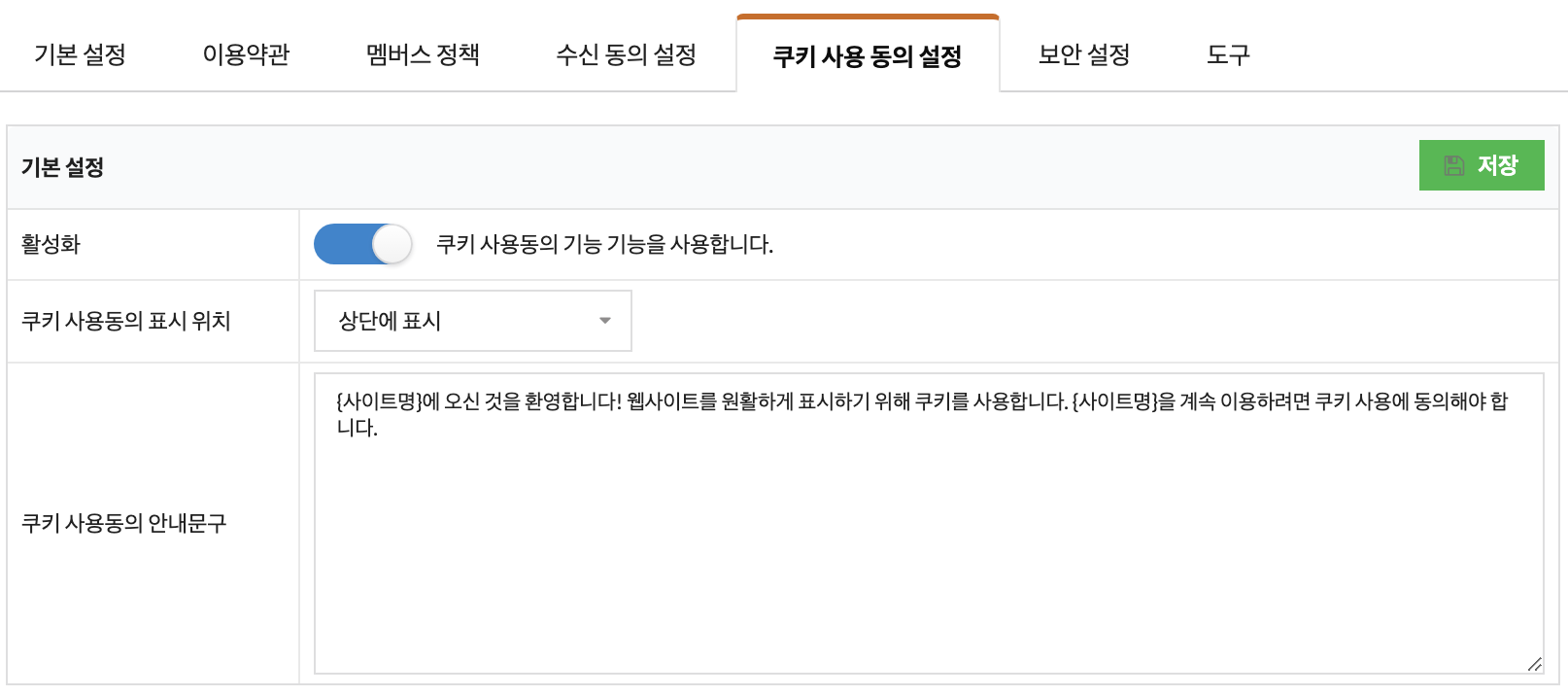 활성화 : 사이트 방문자에게 쿠키 사용동의를 받으려는 경우 활성화합니다.