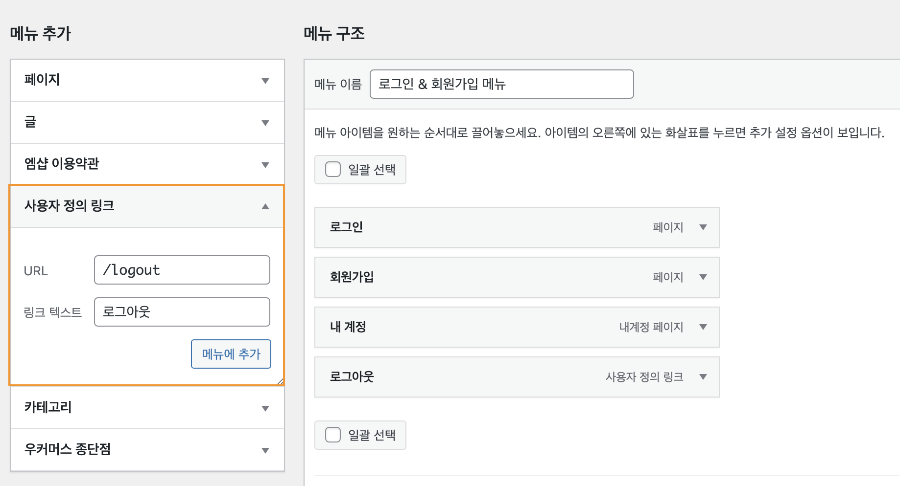 로그아웃 메뉴는 사용자 정의 링크를 이용하여 URL, 링크 텍스트를 입력하여 메뉴에 추가합니다.