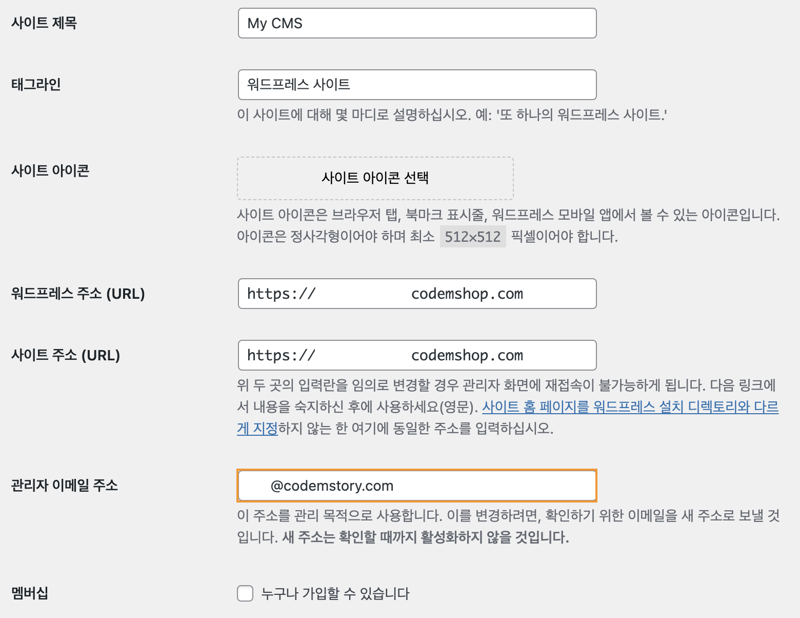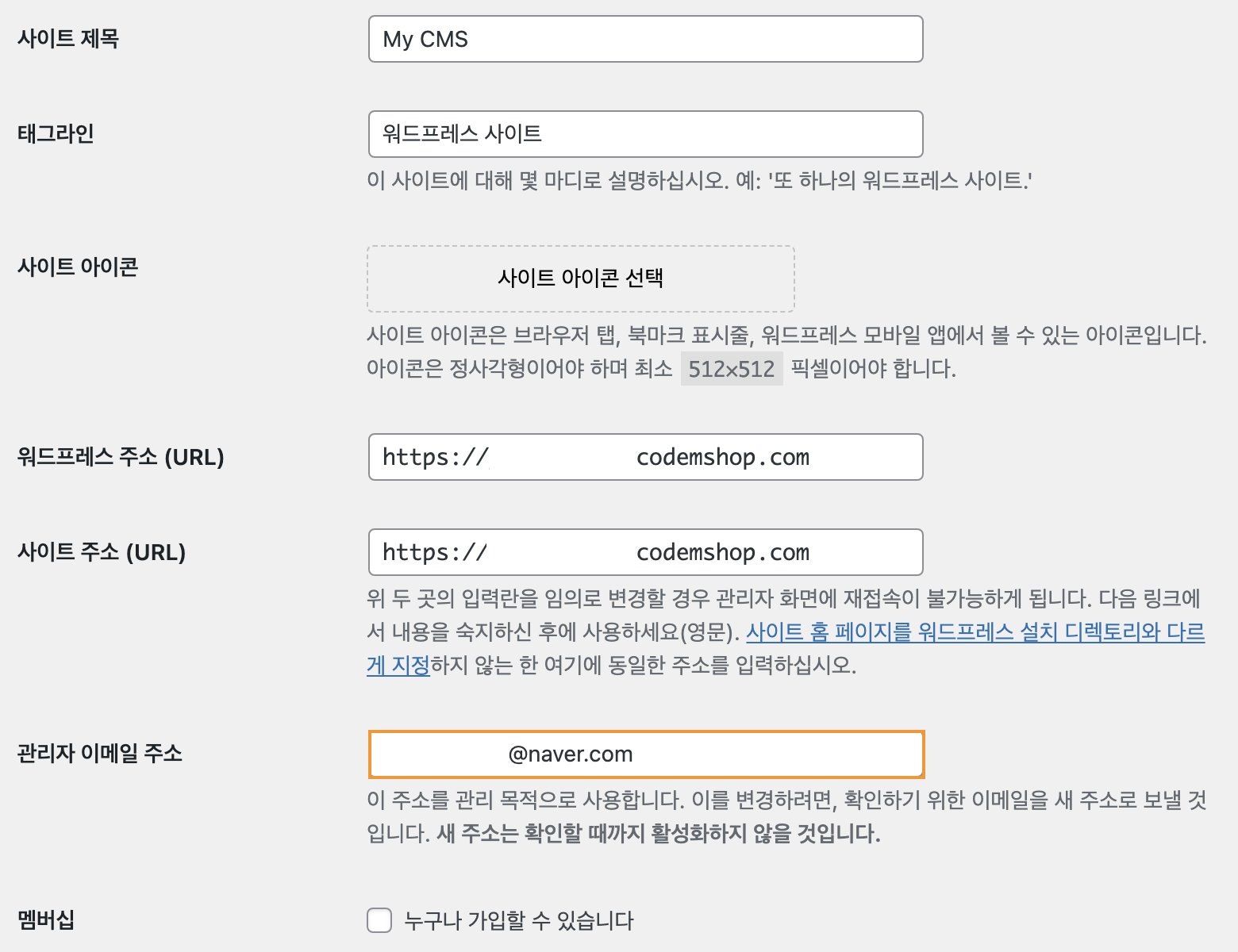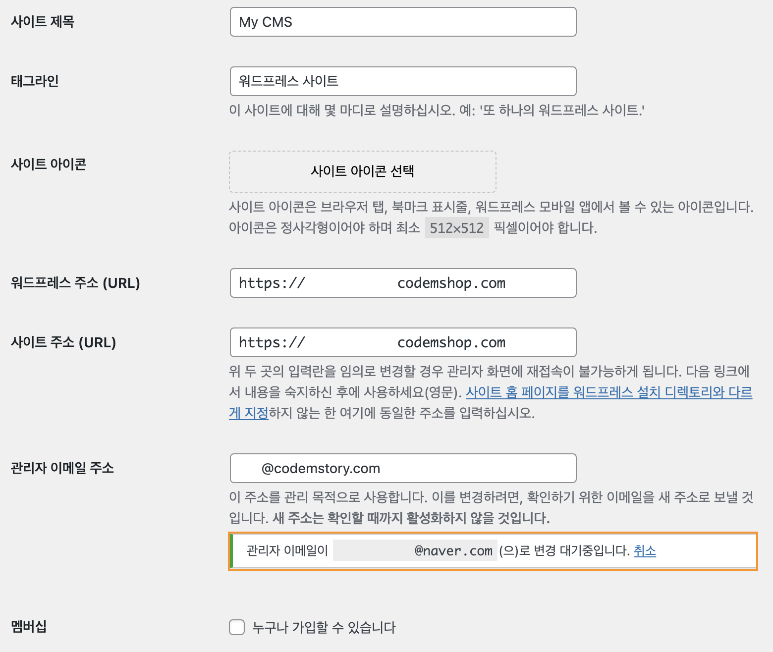 관리자 메뉴 [사이트 설정 > 일반]에서 관리자 이메일 주소 영역에 변경을 원하는 이메일 주소를 입력합니다.