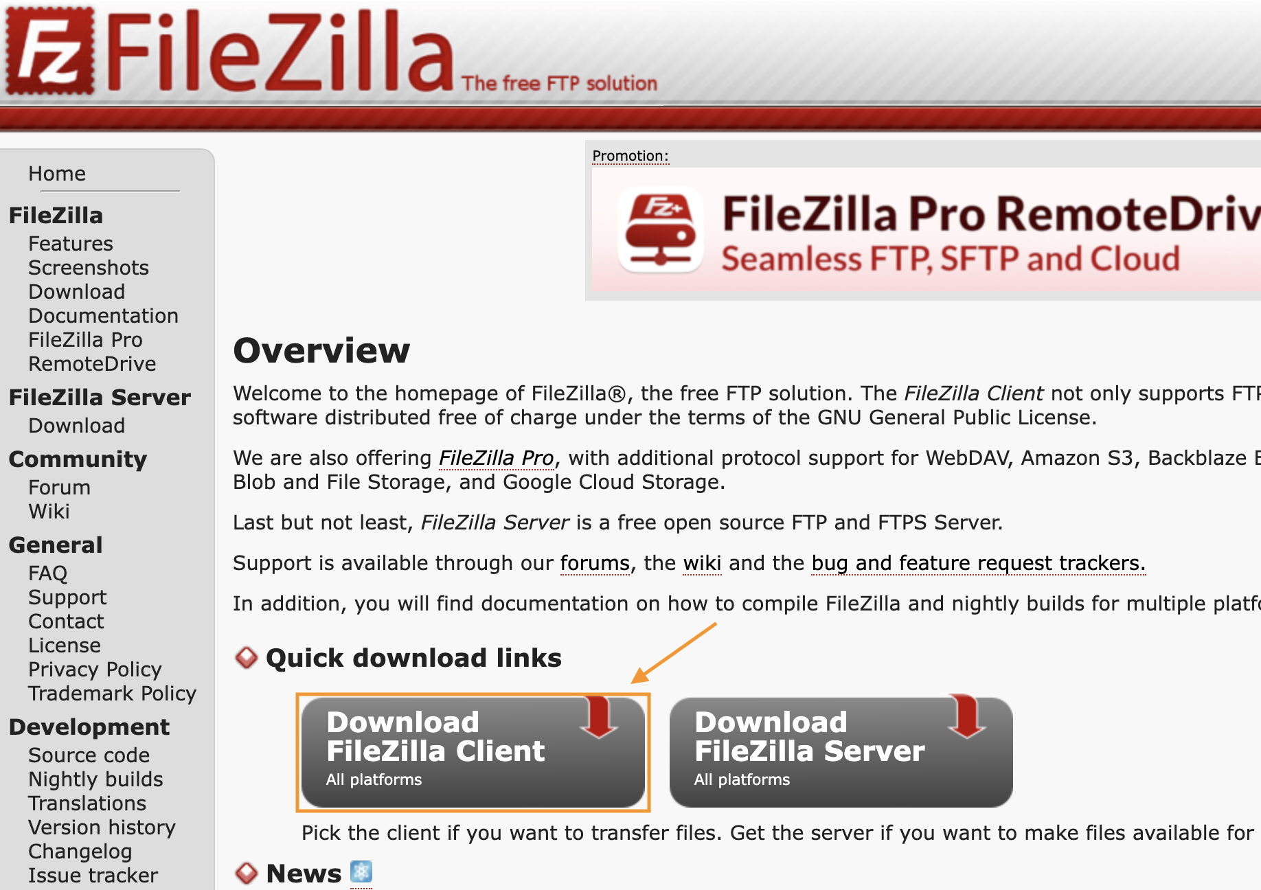 해당 FileZilla 프로그램 사이트에 접속하여 FTP Client 프로그램을 다운로드합니다.