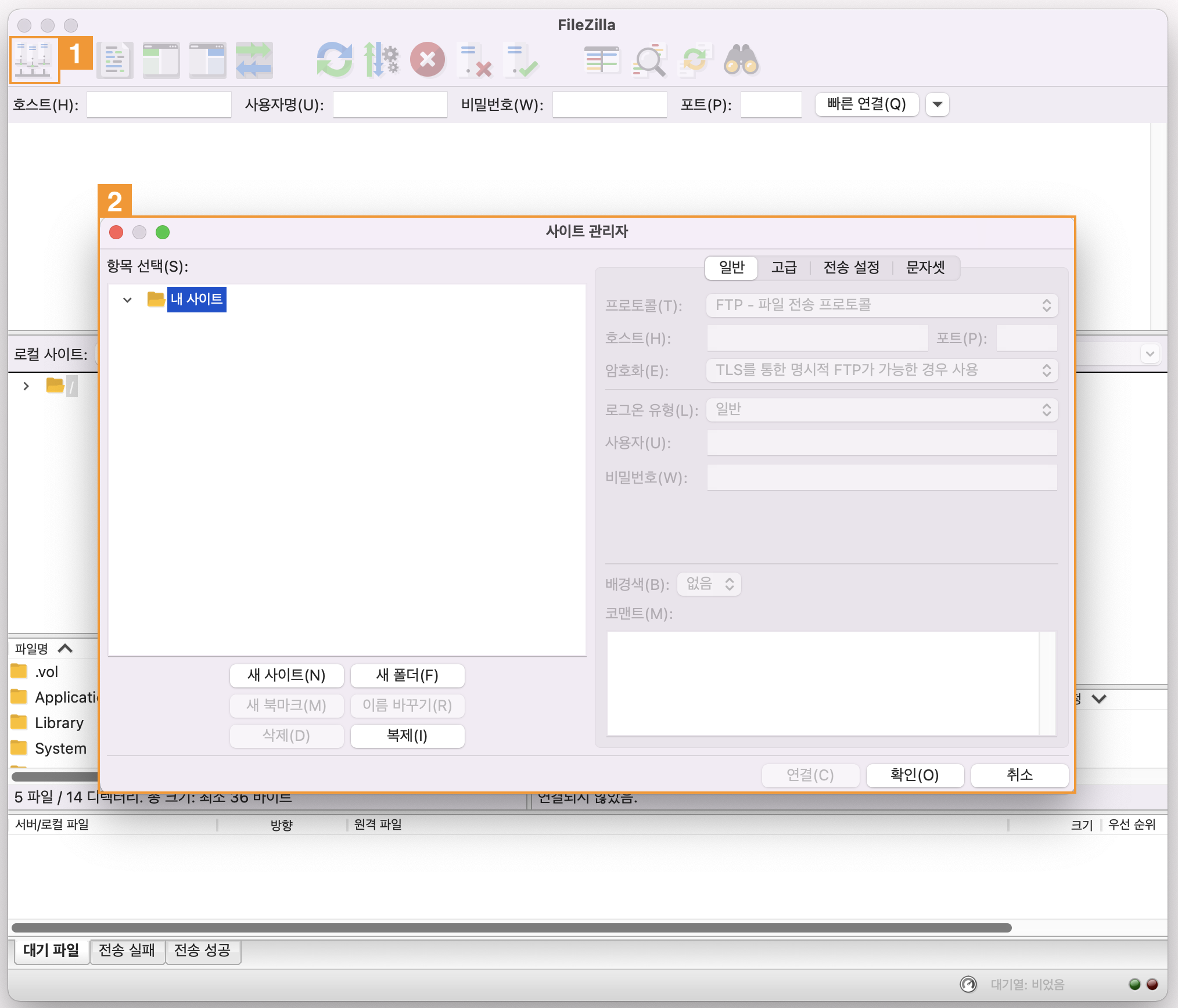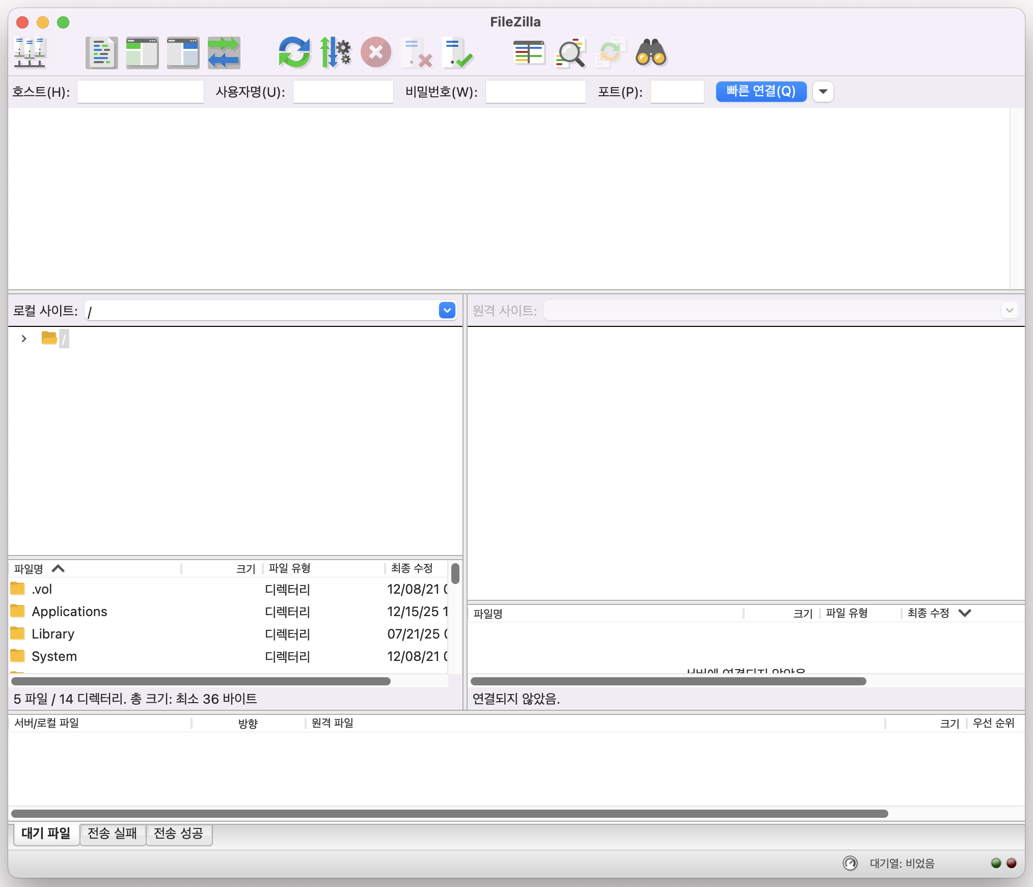 FTP 프로그램인 파일질라(FileZilla) 설치가 완료되었다면, 프로그램을 실행합니다.