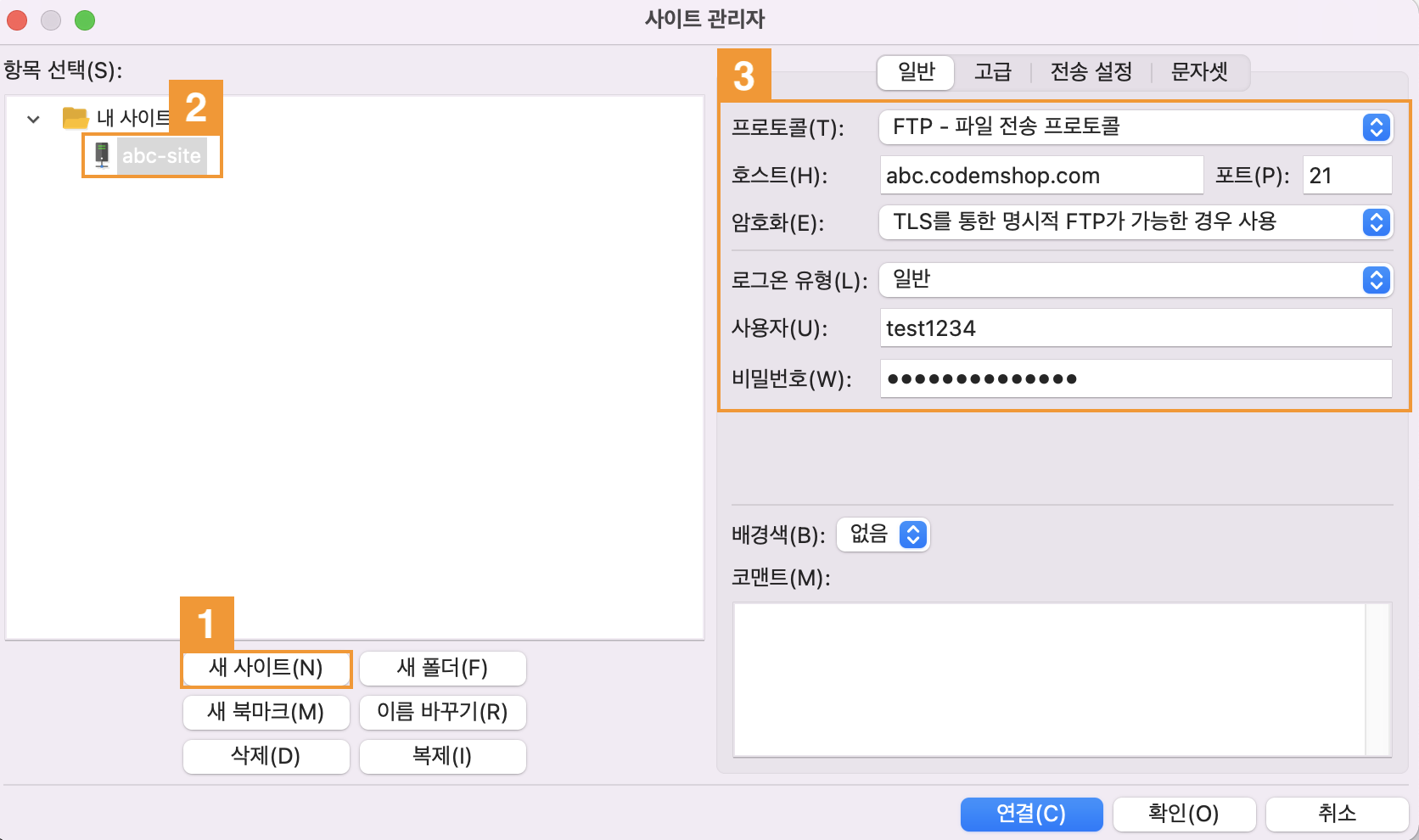 3번 영역에서 전달 받은 FTP 접속 정보를 참고하여 입력하고 하단의 연결 버튼을 클릭하여 접속합니다.