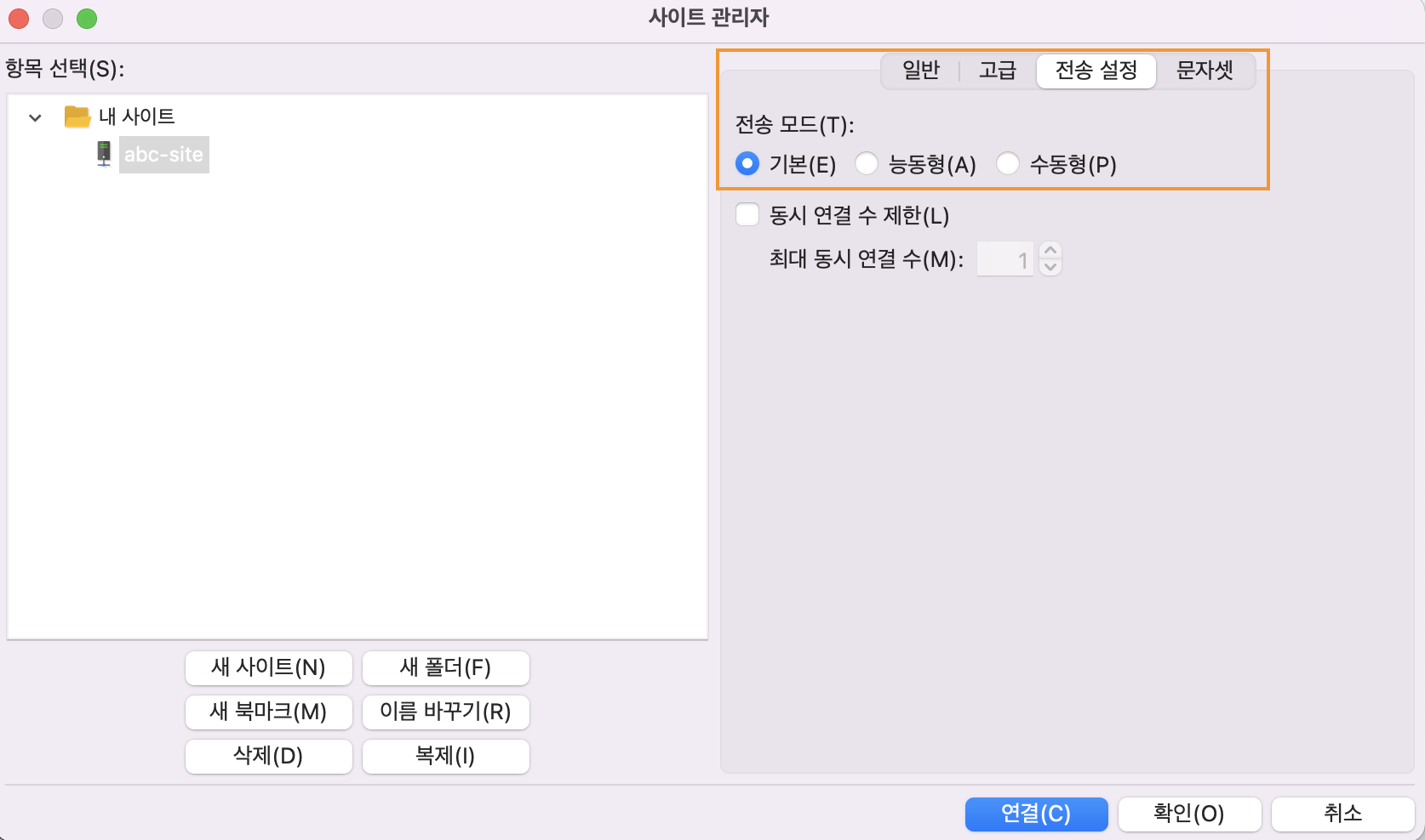 사이트 매니저에서 우측의 전송 설정 탭을 클릭합니다.
