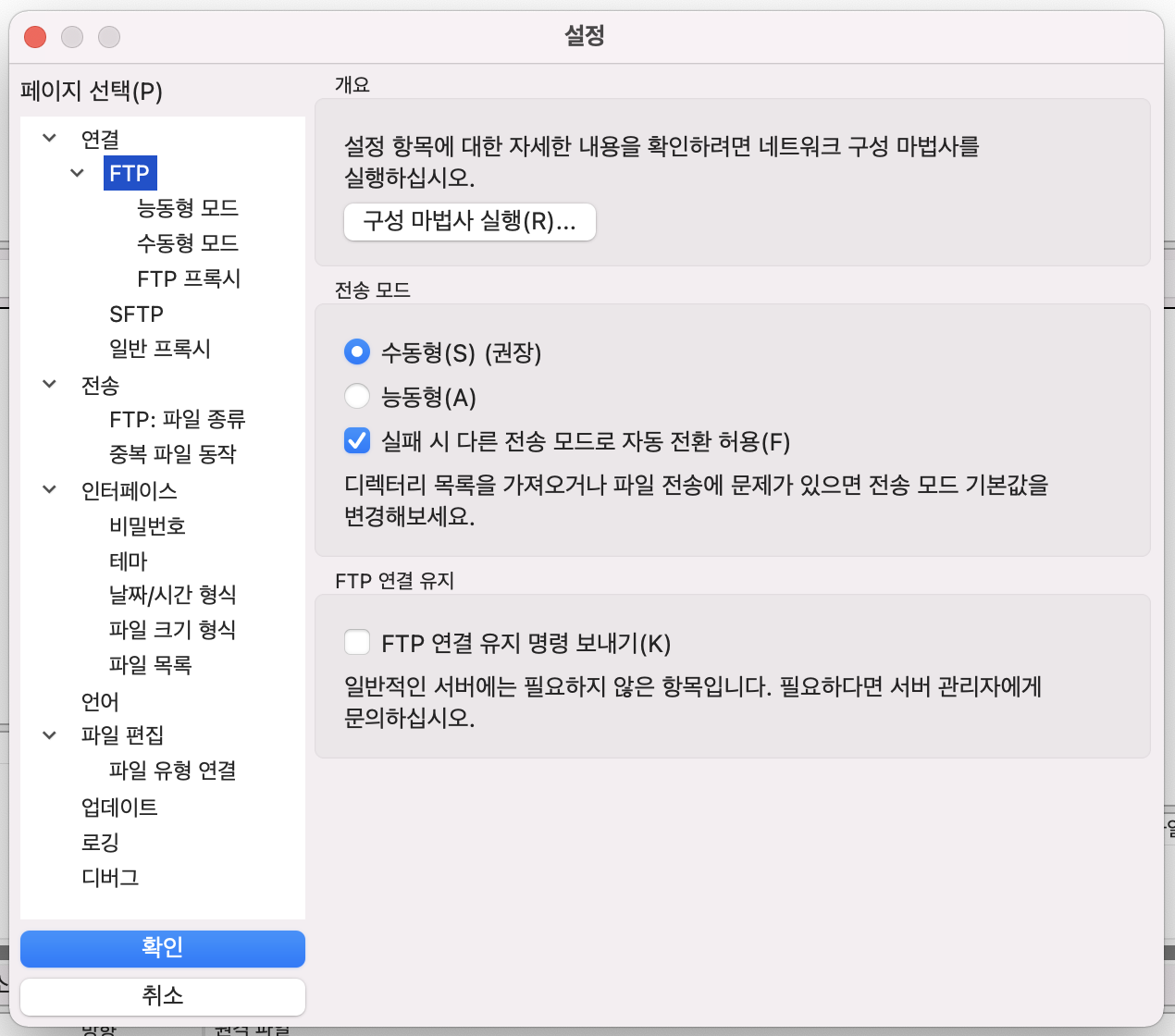 전송 모드 변경으로도 해결되지 않는 경우 파일질라 설정에서 전송 모드를 변경합니다.