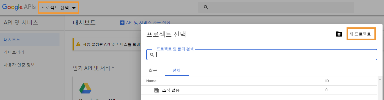 상단의 프로젝트 선택 > 새 프로젝트를 클릭합니다.