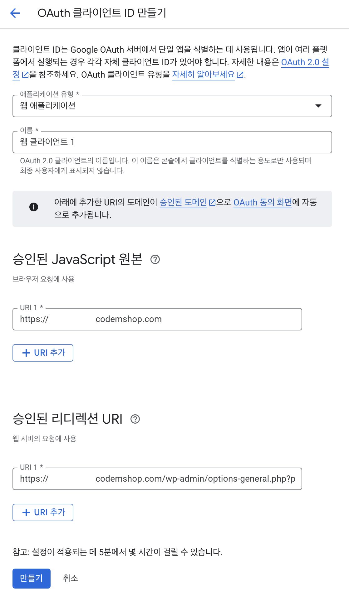 승인된 리디렉션 URI 영역에사이트 주소/wp-admin/options-general.php?page=gmail-smtp-settings&action=oauth_grant와 같이 입력한 후 만들기 버튼을 클릭합니다.