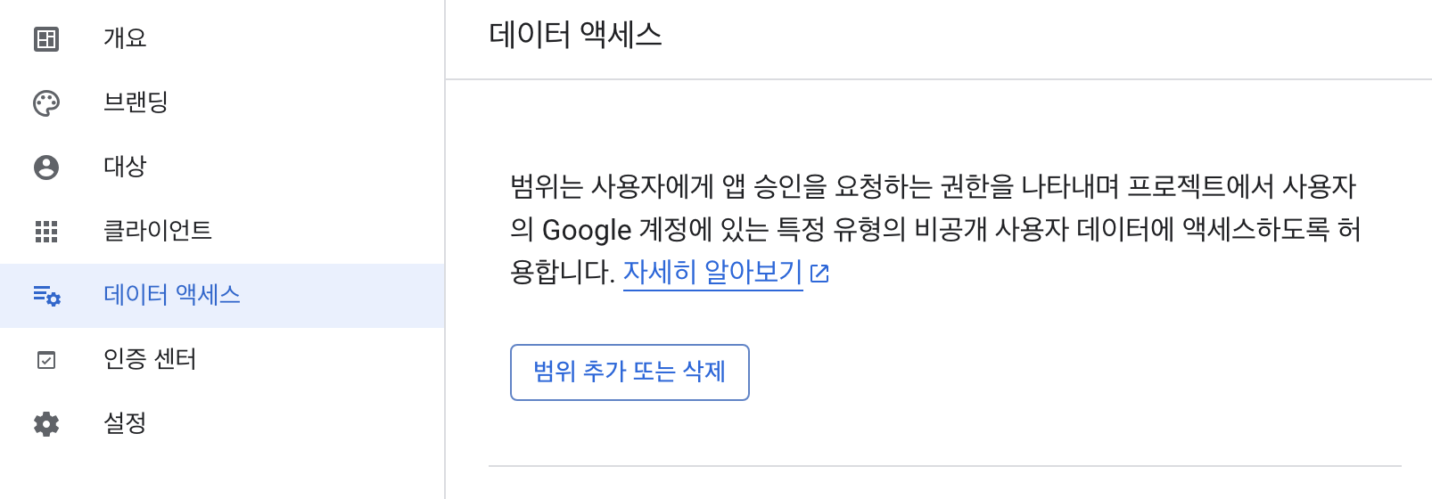 좌측 메뉴에서 데이터 액세스를 클릭한 후, 범위 추가 또는 삭제 버튼을 클릭합니다.