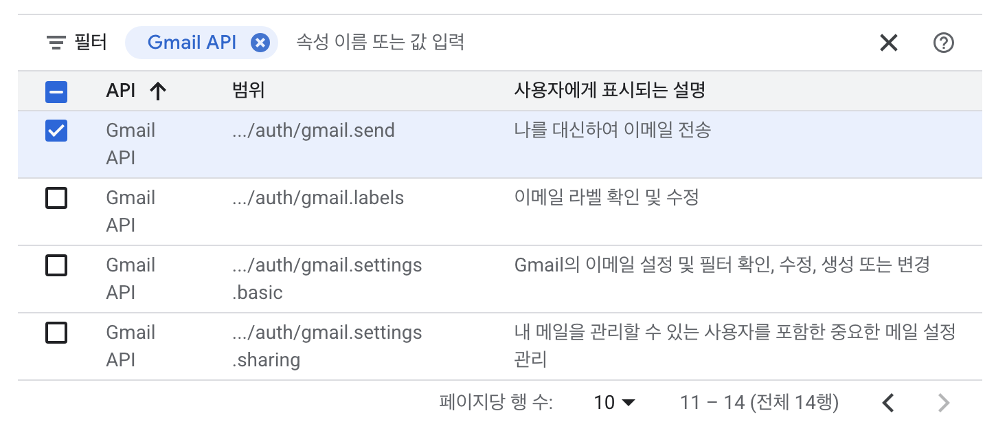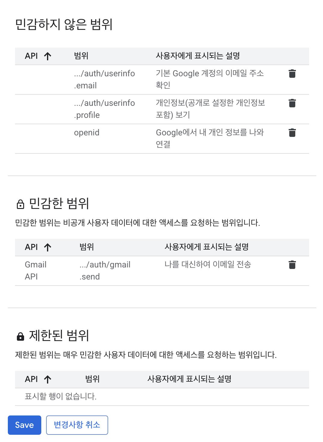 이미지와 같이 나를 대신하여 이메일 전송을 포함한 범위들을 추가하고 저장 버튼을 클릭합니다.
