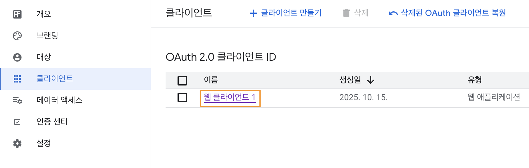 좌측 메뉴에서 클라이언트 메뉴를 클릭하여 생성한 클라이언트 ID 이름을 클릭합니다.