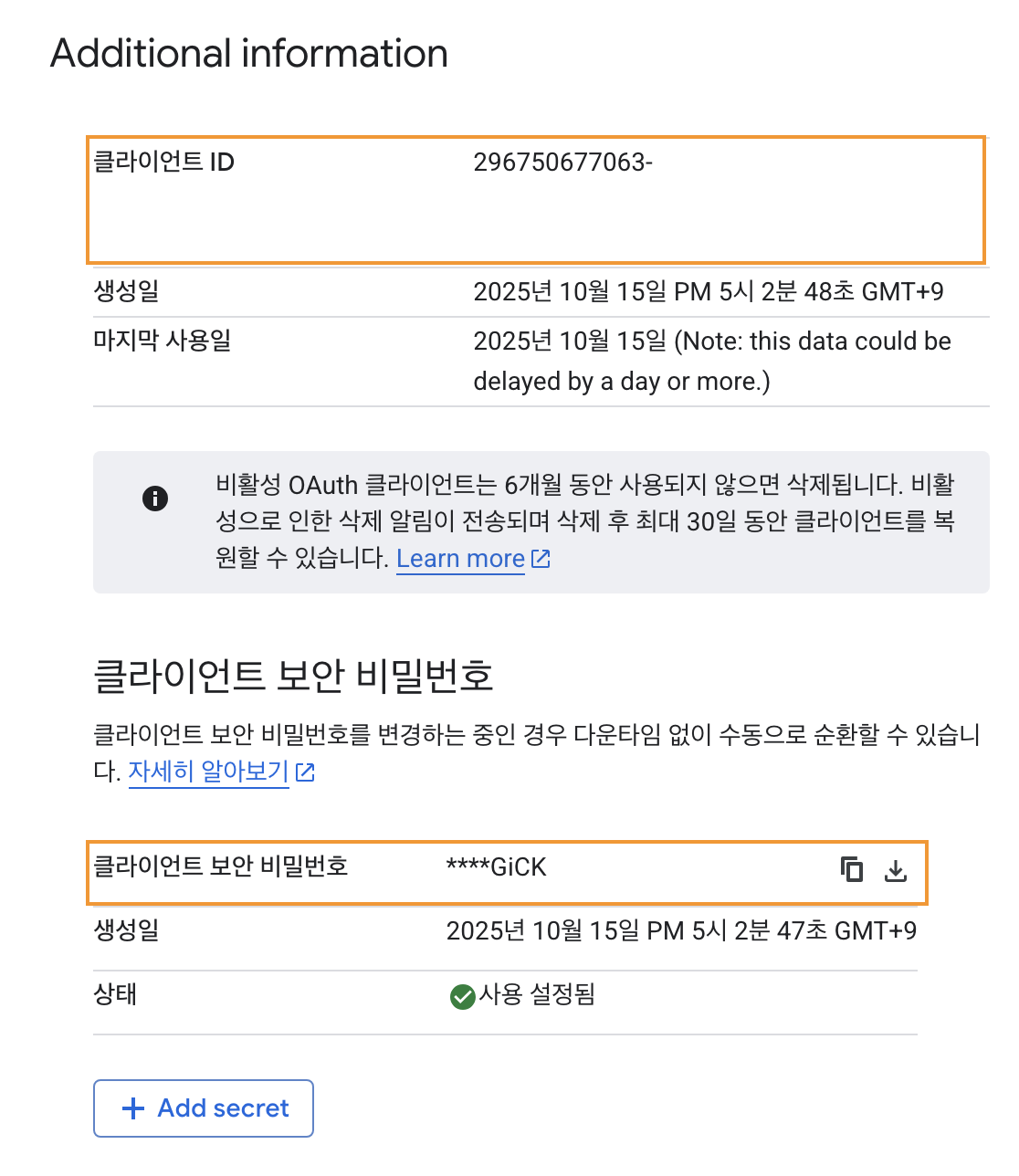 우측에 표시되는 클라이언트 ID, 클라이언트 보안 비밀번호를 관리자 메뉴 [설정 > Gmail SMTP > General(탭)]의 Client ID, Client Secret 영역에 각각 입력합니다.