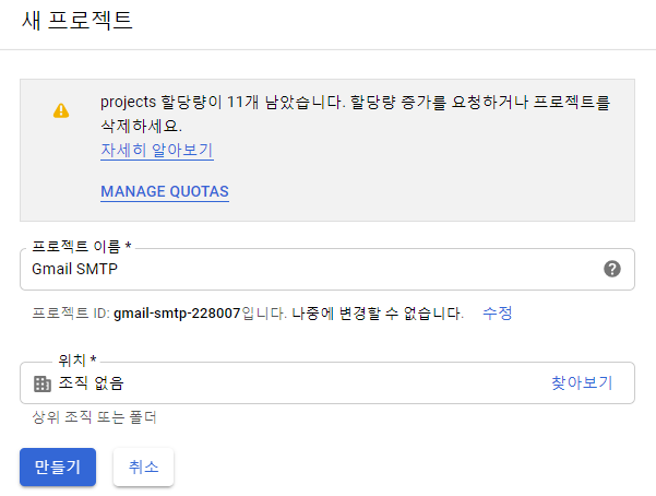 프로젝트 이름을 입력한 후 만들기 버튼을 클릭합니다.