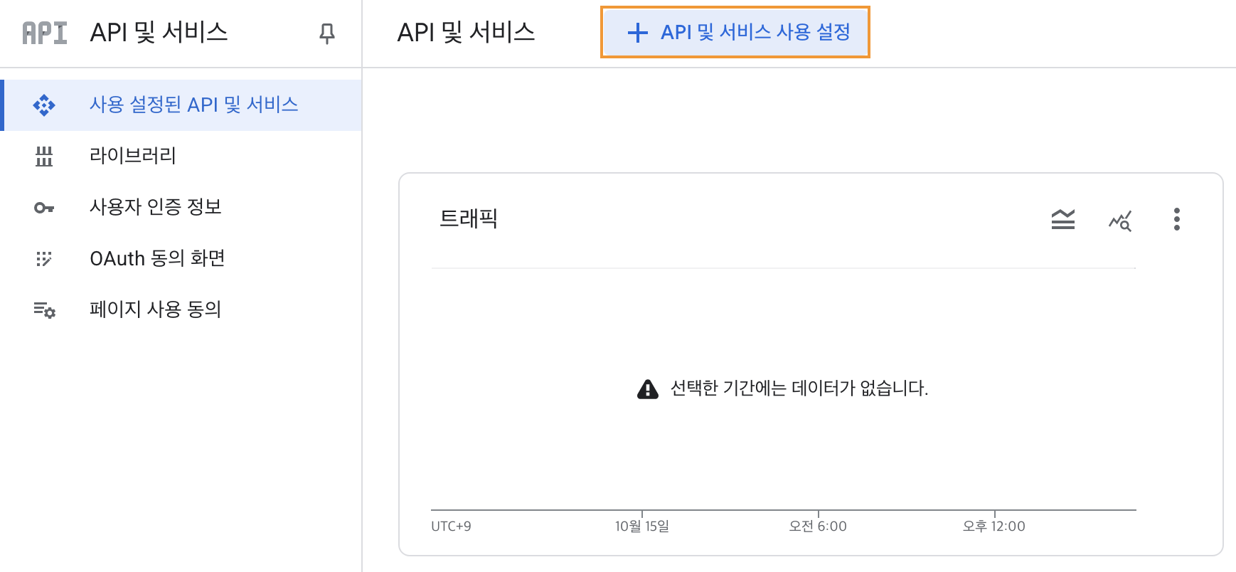 상단의 API 및 서비스 사용 설정을 클릭합니다.