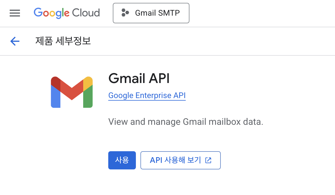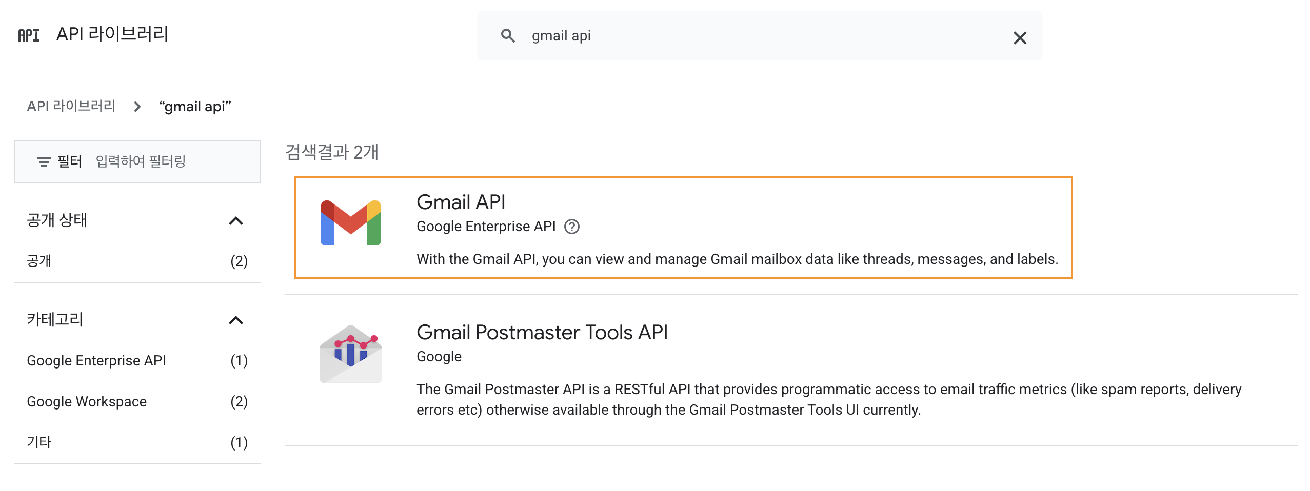 검색창에 Gmail API를 검색하면 검색 결과에 표시되는 Gmail API를 클릭하여 사용 버튼을 클릭합니다.