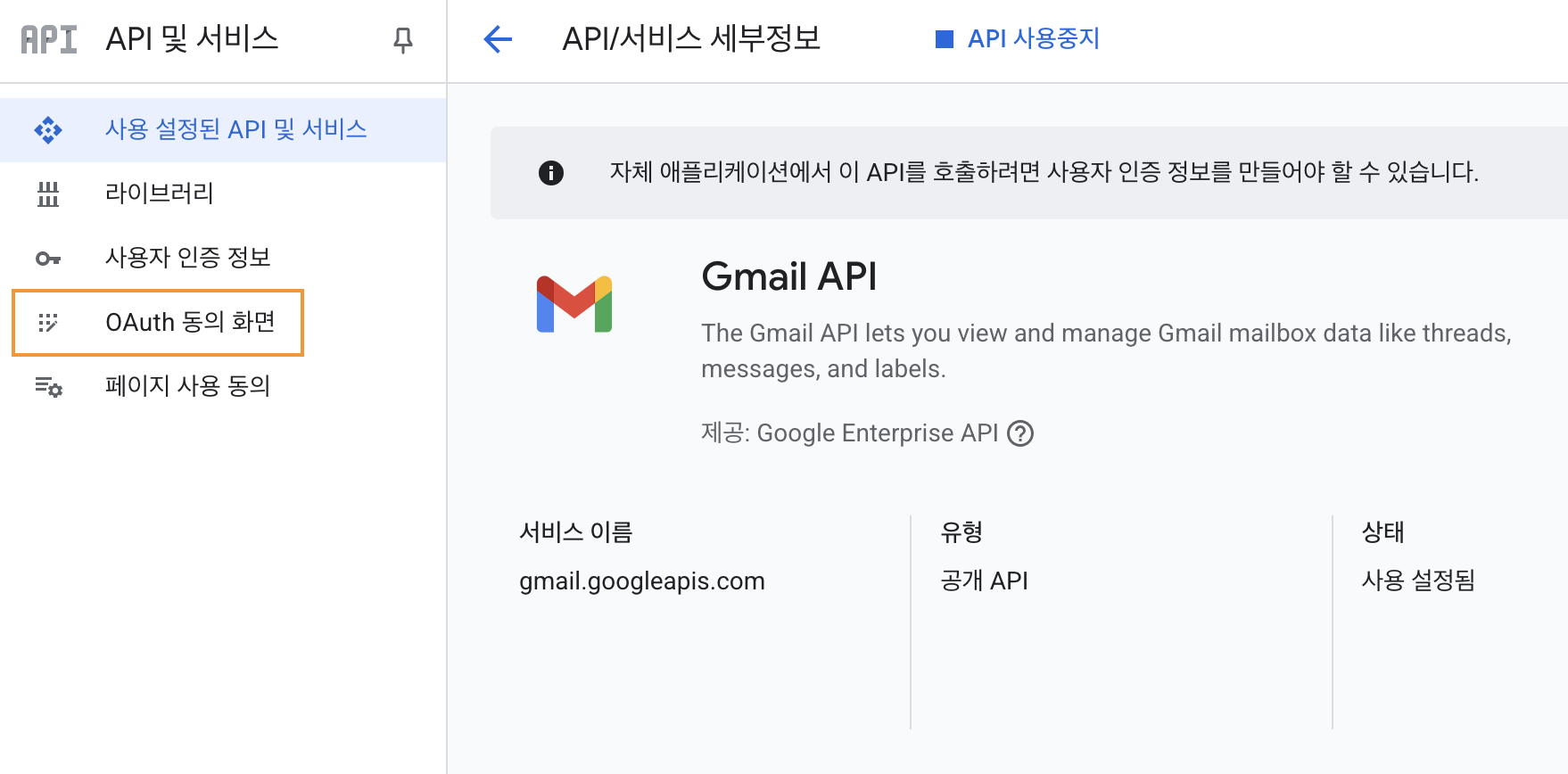 좌측 메뉴에서 OAuth 동의 화면 메뉴를 클릭합니다.