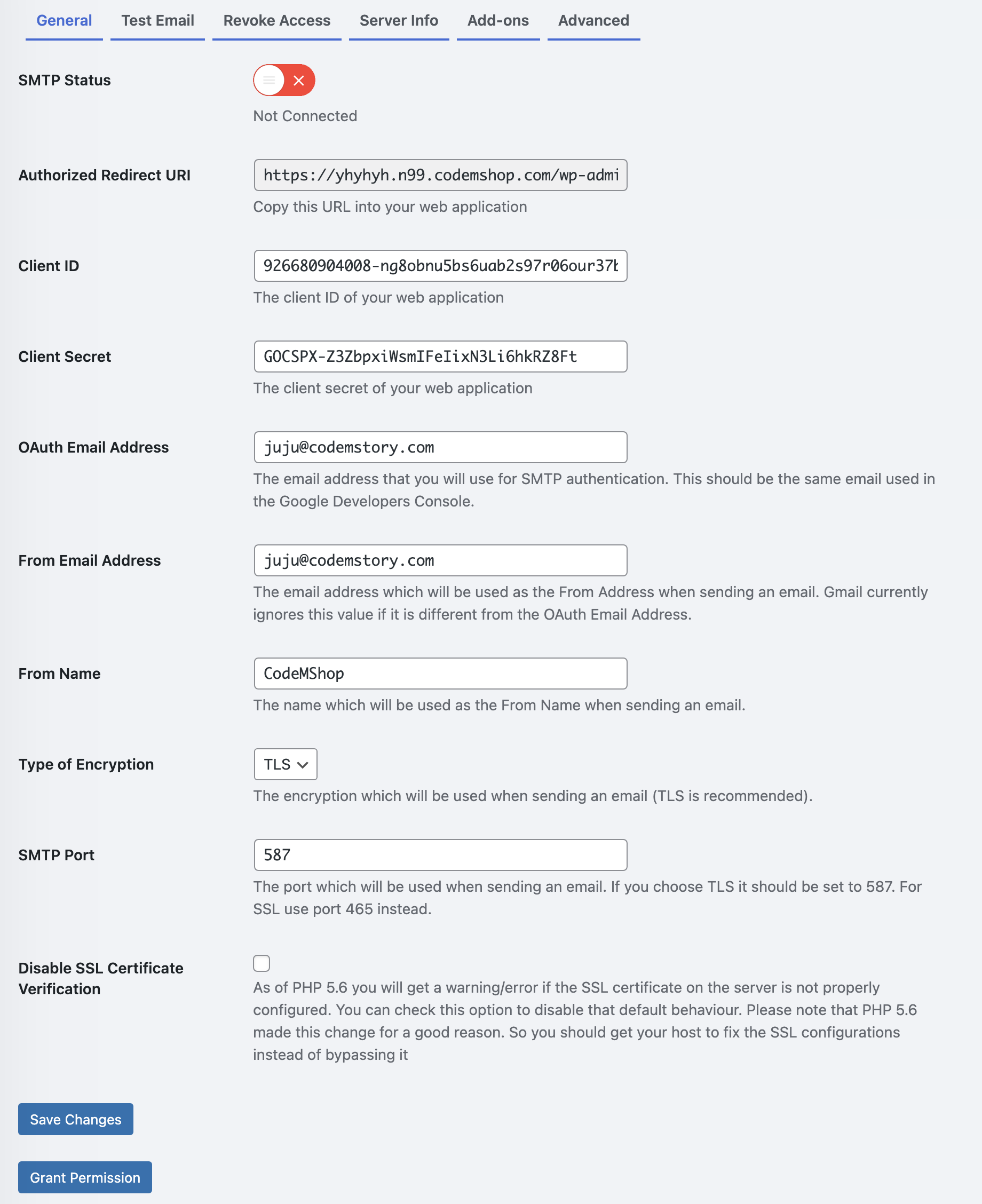 OAuth Email Address와 From Email Address 영역에 Google Cloud에서 사용된 이메일을 입력합니다.