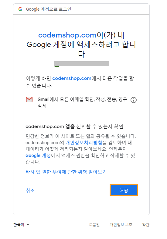 허용 버튼을 클릭하여 설정을 완료합니다.