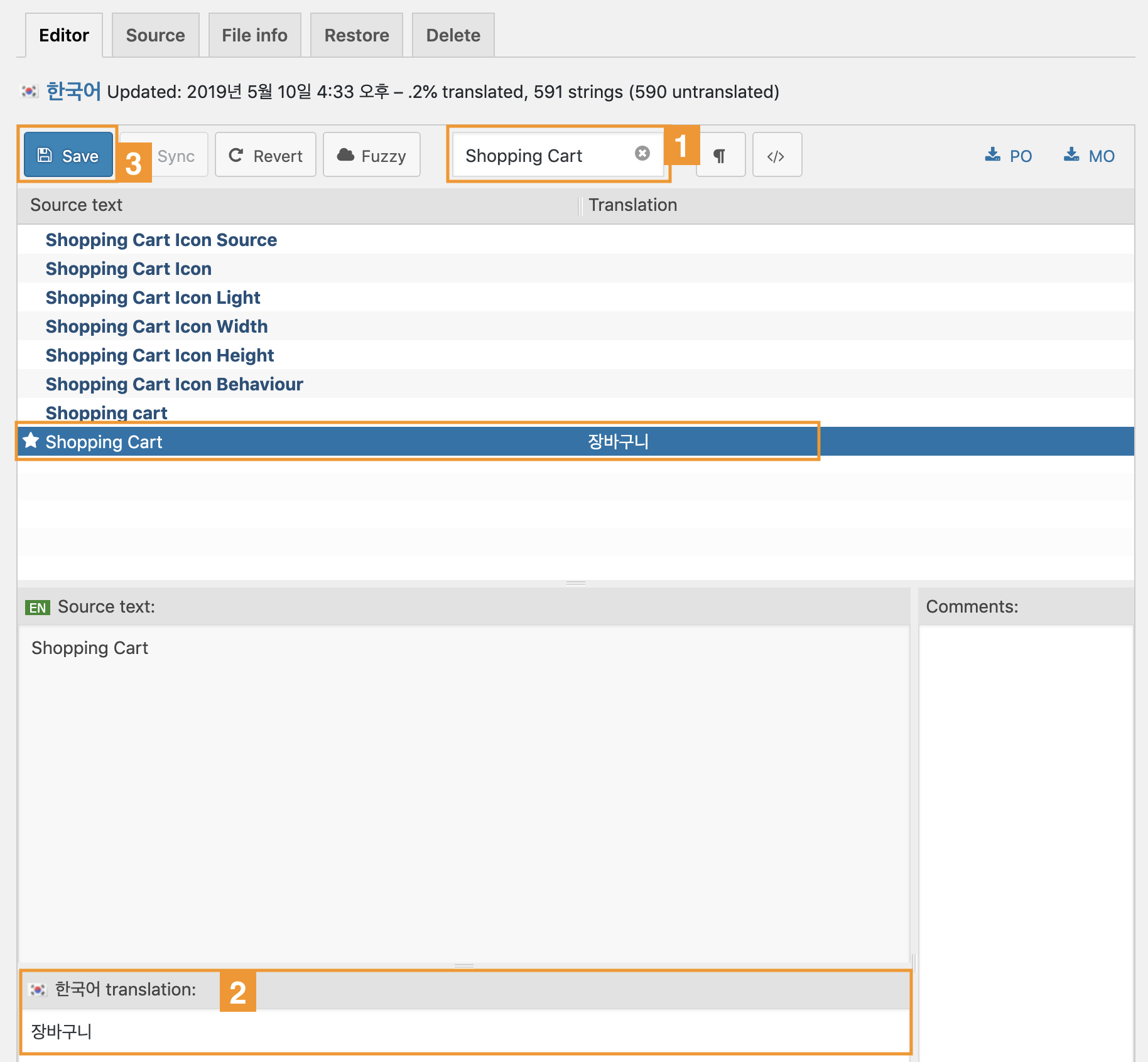 3rd Party 플러그인을 통해 게시판을 추가하거나, 리뷰, 상품에 기능을 추가한 경우 해당 기능을 제공하는 플러그인의 언어팩에서 문자열을 번역해야 합니다.