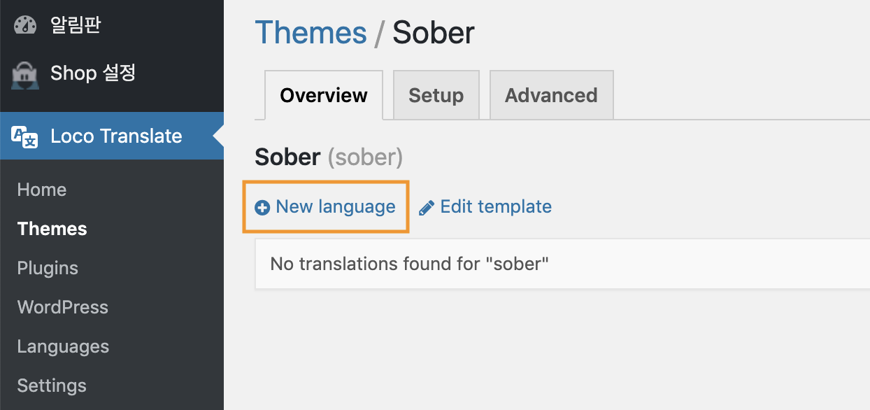 관리자 메뉴 [Loco Translate > 언어]에서 번역이 필요한 문자열의 언어를 선택합니다.