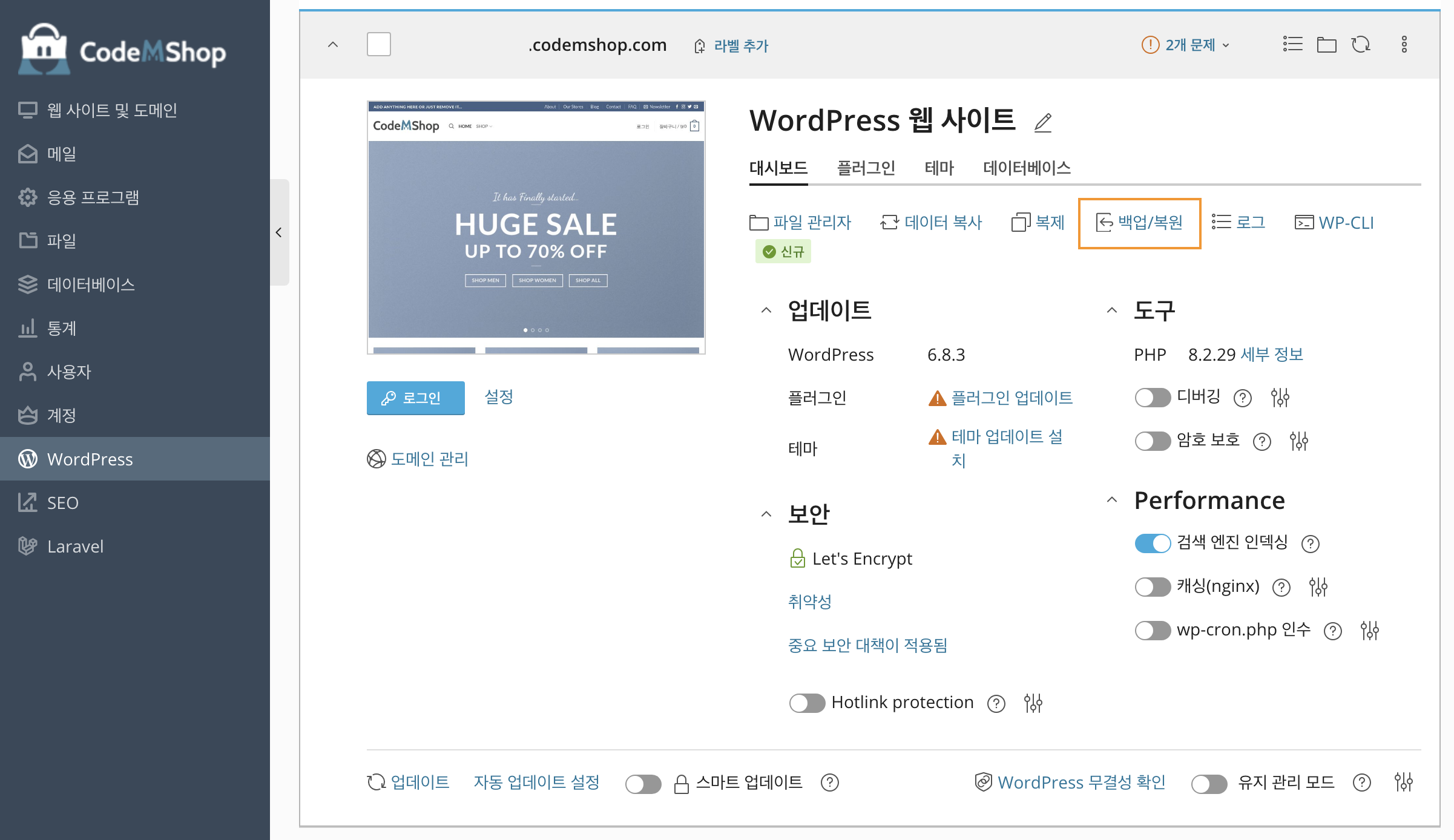 코드엠샵 호스팅 관리 패널을 통해 워드프레스 쇼핑몰, 워드프레스 사이트를 쉽게 관리하세요.