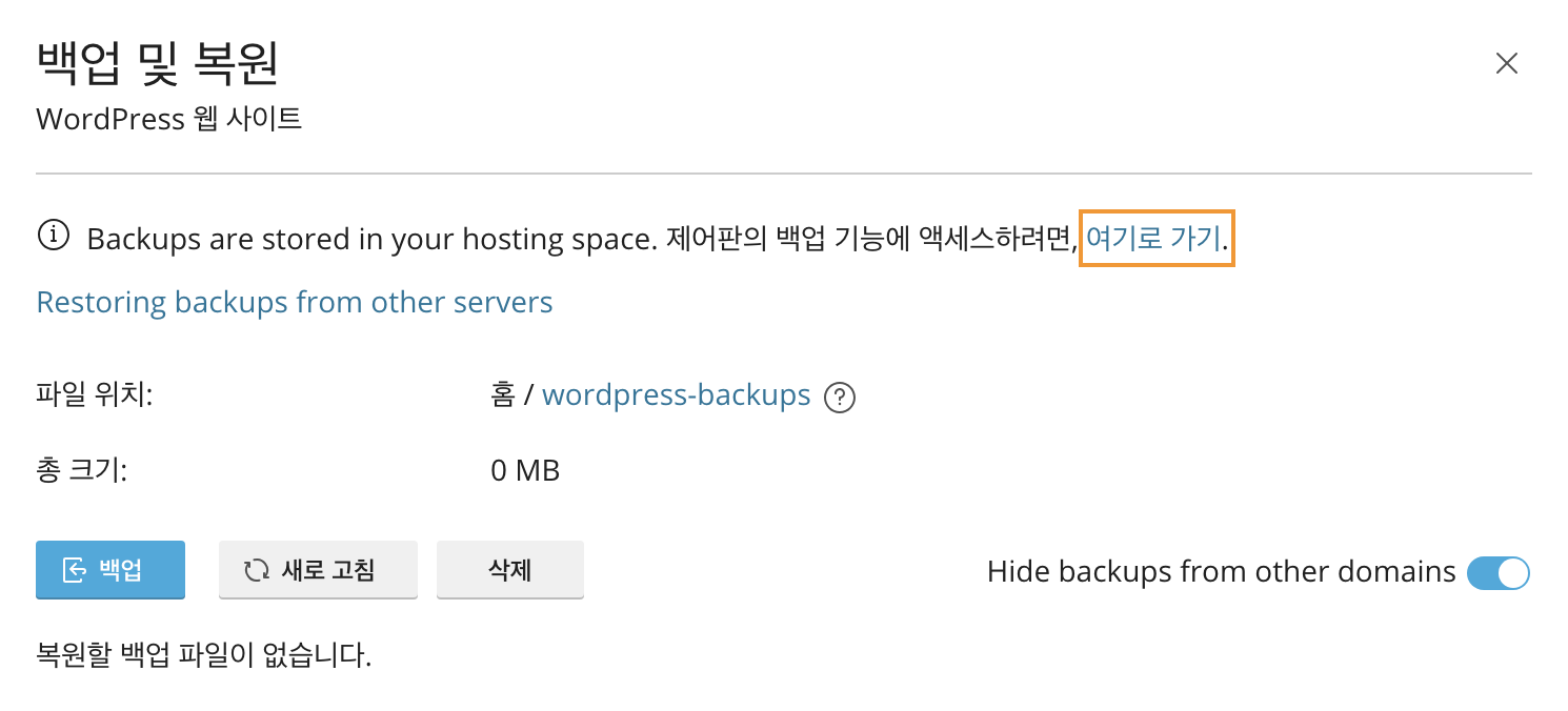 호스팅 관리 패널의 [WordPress > 대시보드(탭)]에서 백업/복원 버튼을 클릭합니다.