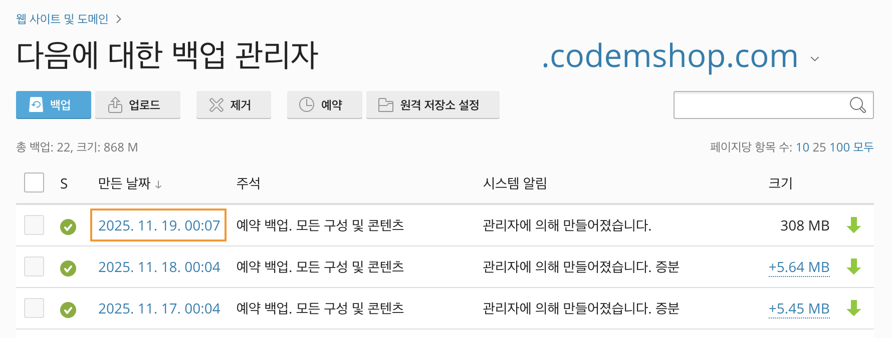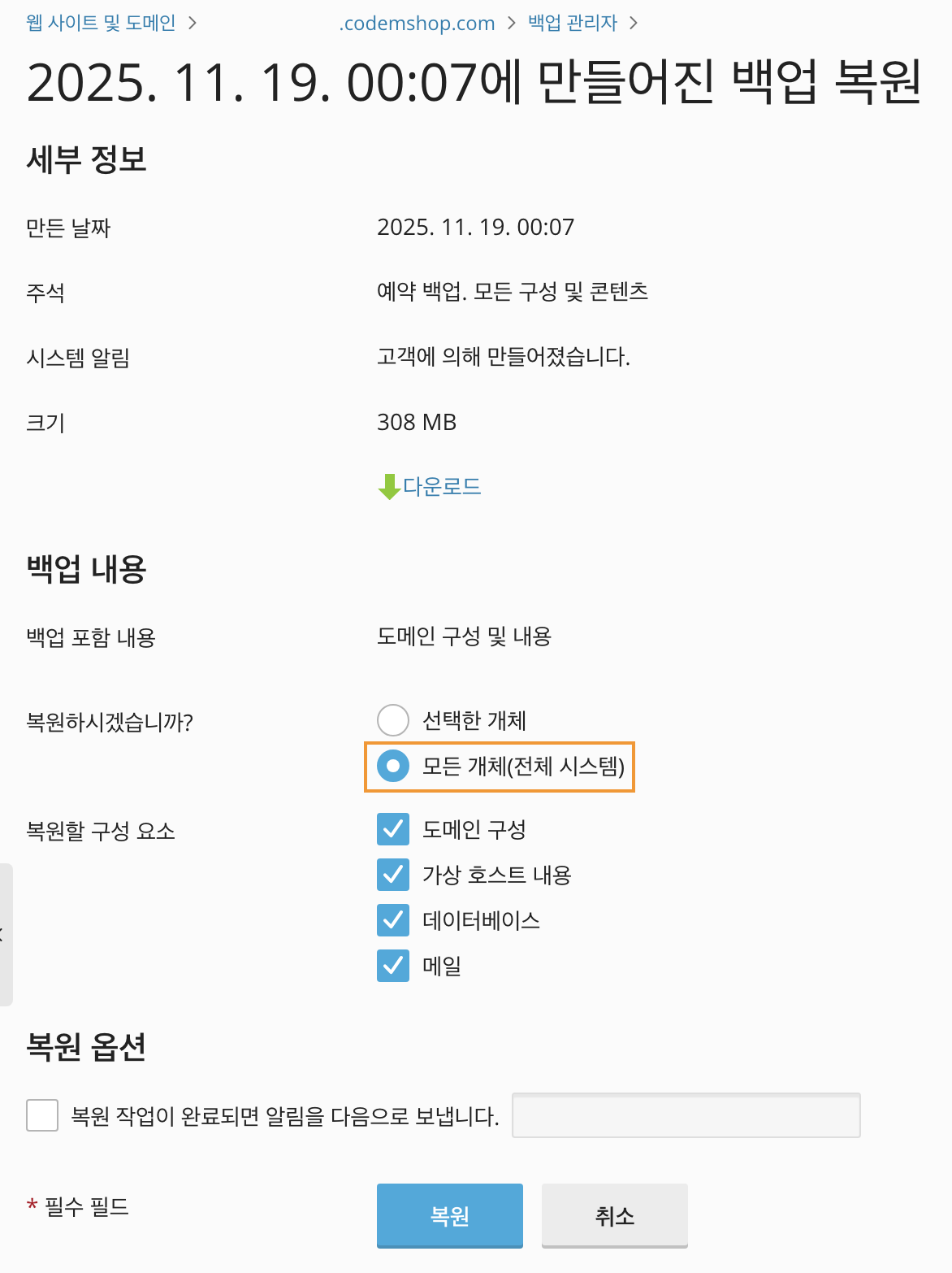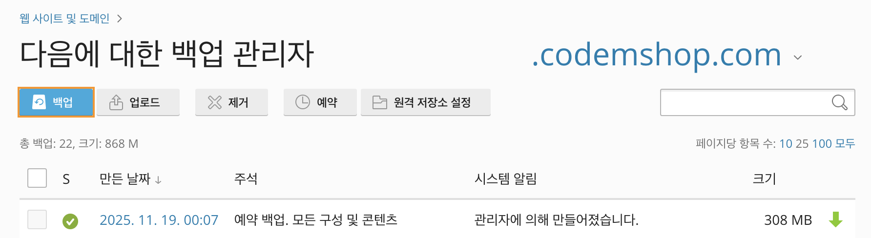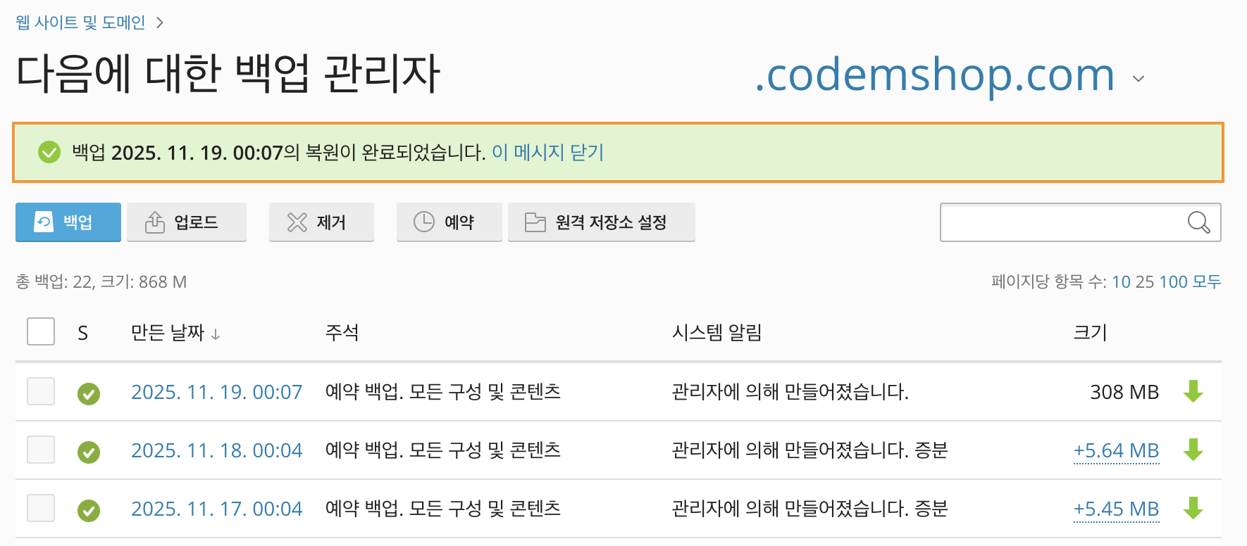 백업 및 복원 기능을 이용하여 작업 진행 전 백업본을 생성하고 오류가 발생할 시 복원하여 사이트를 이전 상태로 되돌릴 수 있습니다.