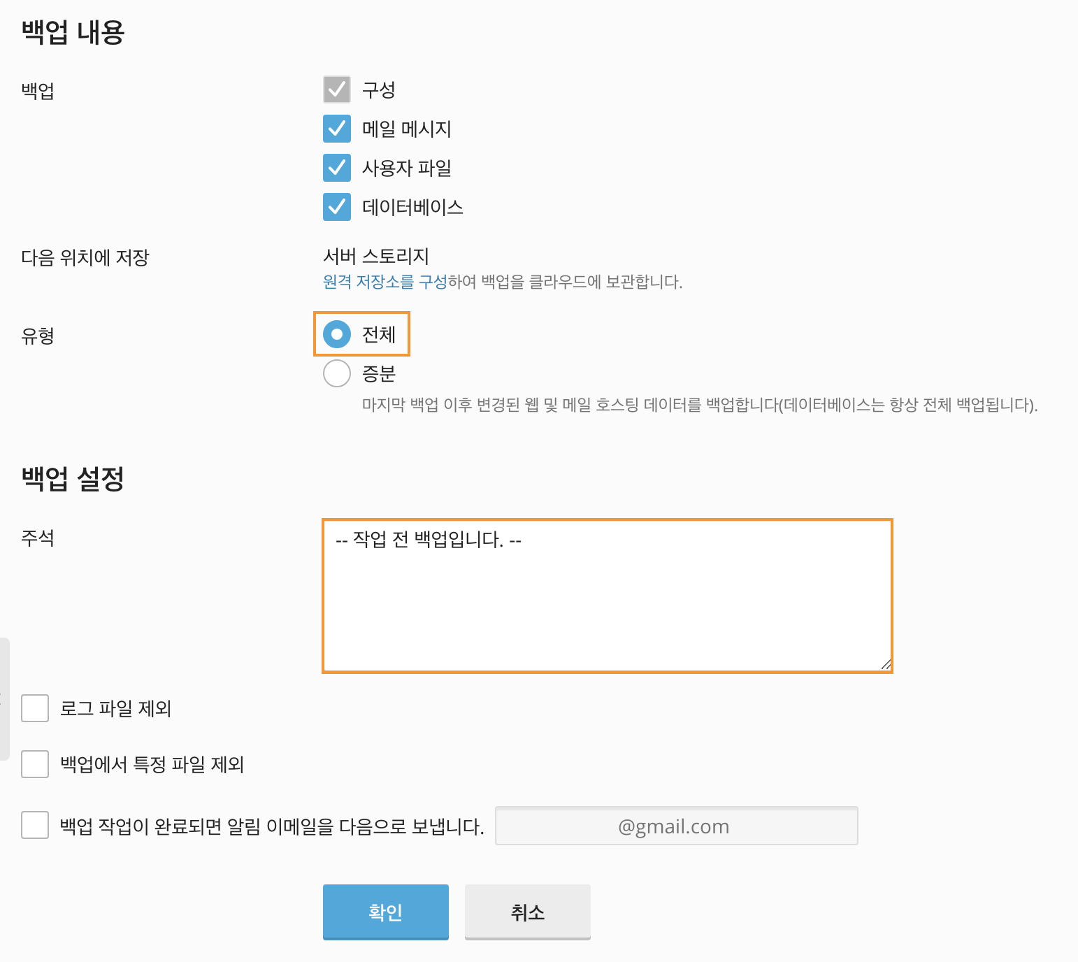 유형을 전체로 선택하고, 언제 생성된 백업 파일인지 알 수 있도록 주석을 단 후, 확인 버튼을 클릭하여 백업본을 생성합니다.