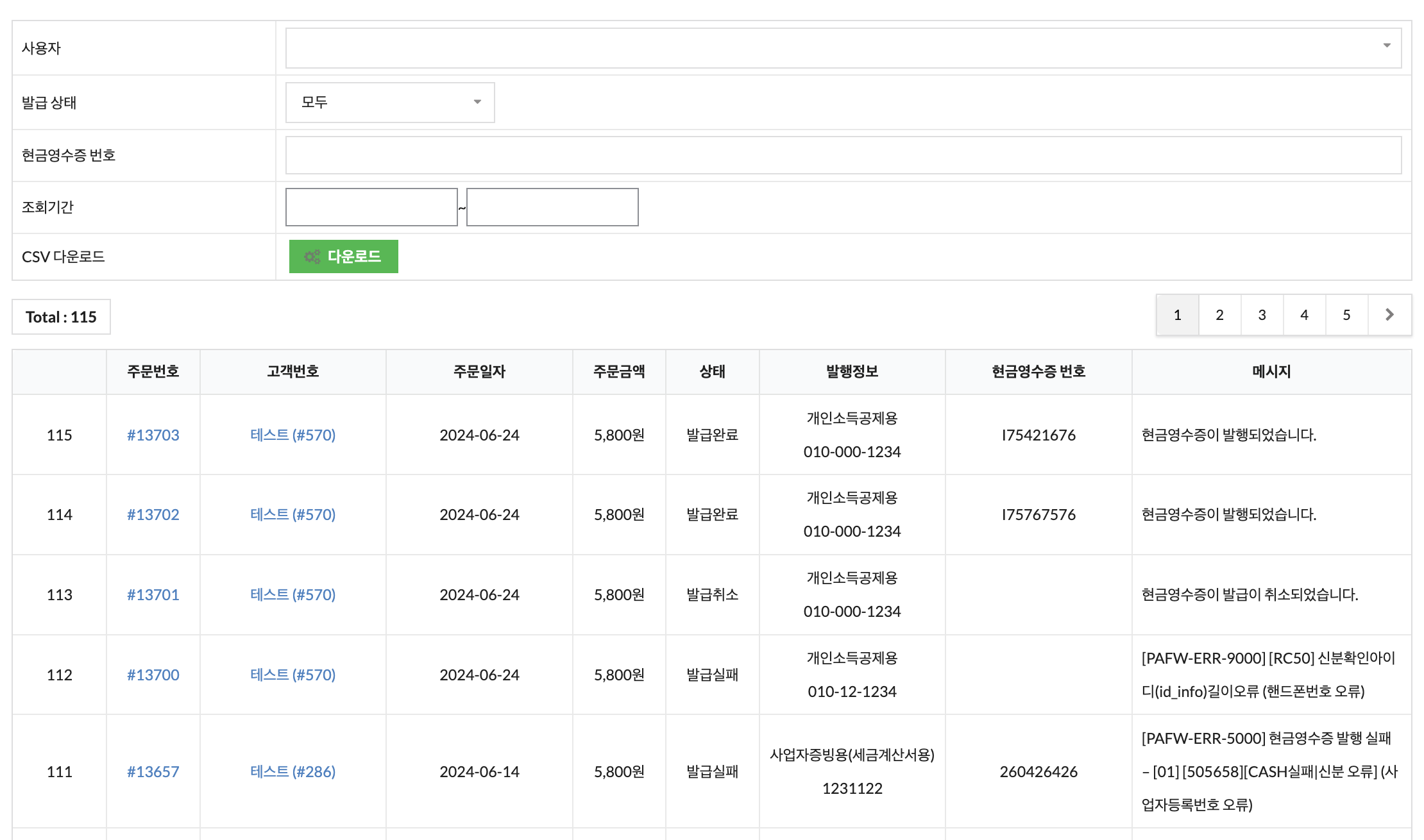 발급 실패 : [PAFW-ERR-5000] 현금영수증 발행 실패 – [01] [505658][CASH실패|신분 오류] (사업자등록번호 오류)