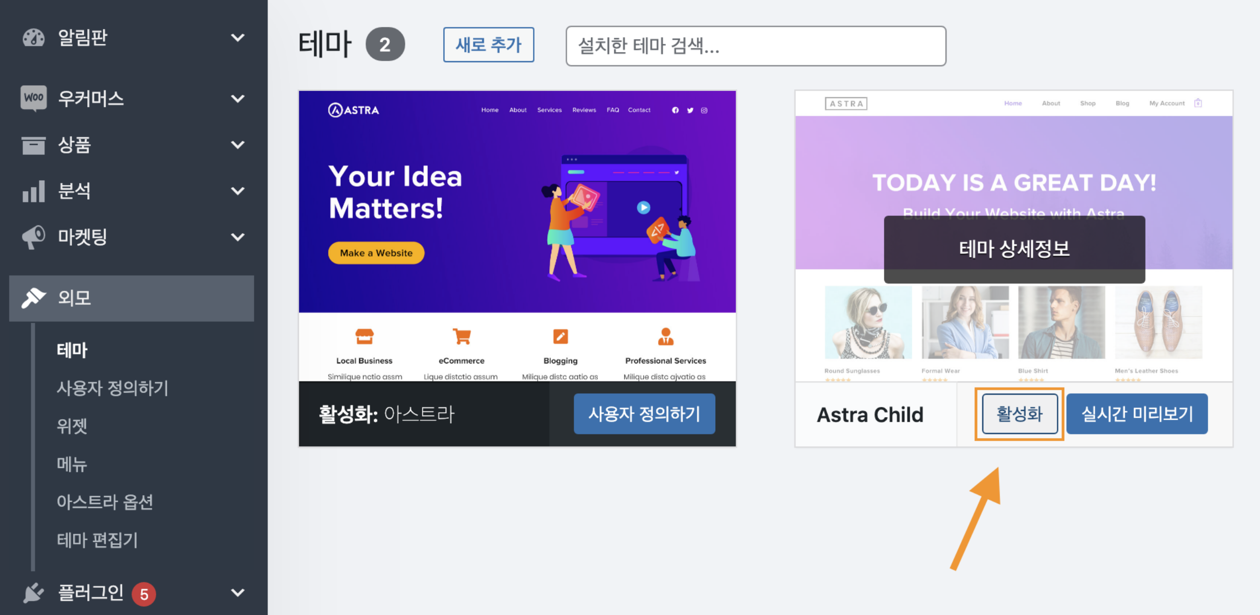 예시 : 부모 테마가 astra인 경우 차일드 테마명은