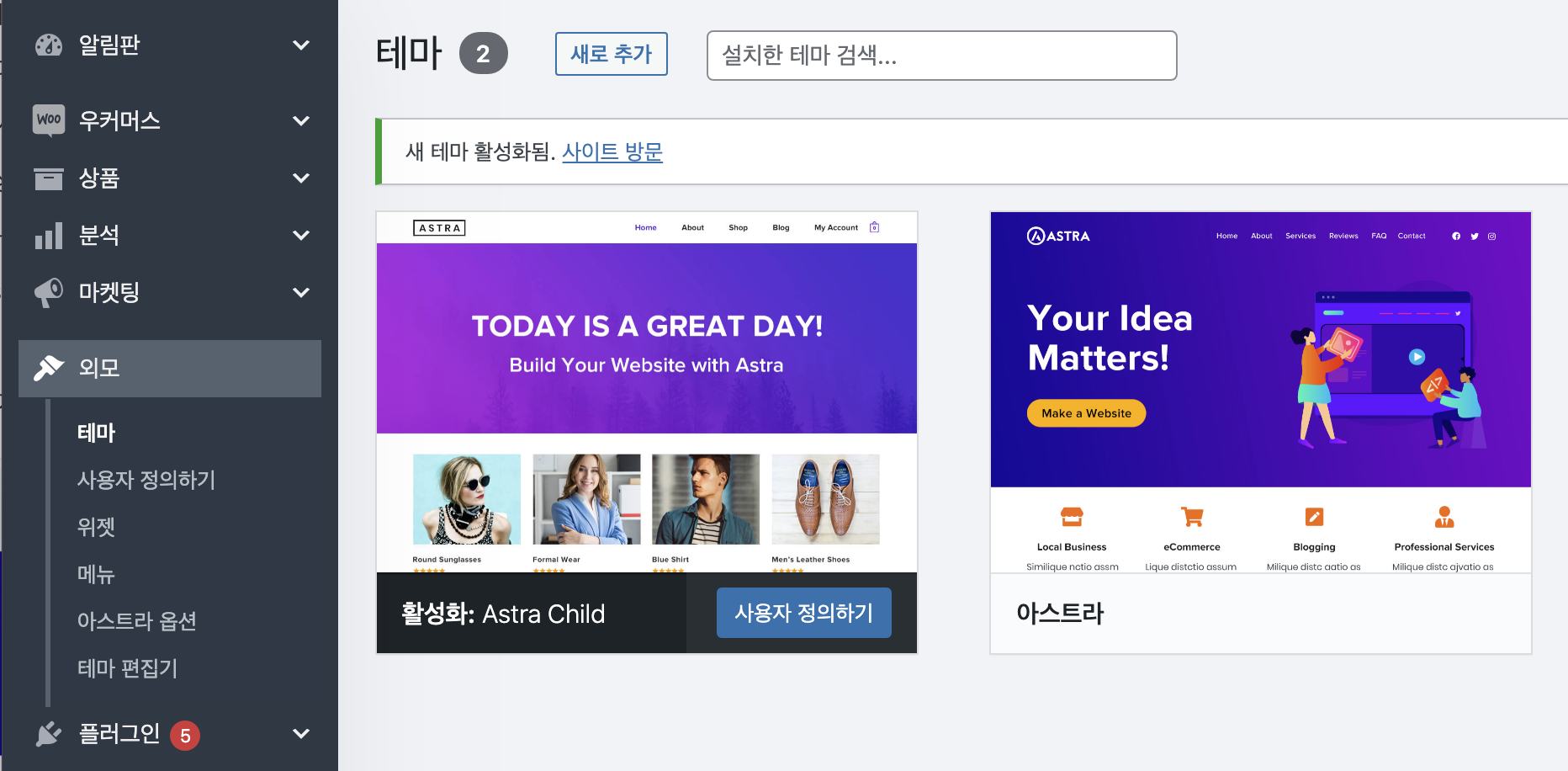 일부 테마에서 차일드 테마 활성화 후 테마 옵션이 달라질 수 있습니다.