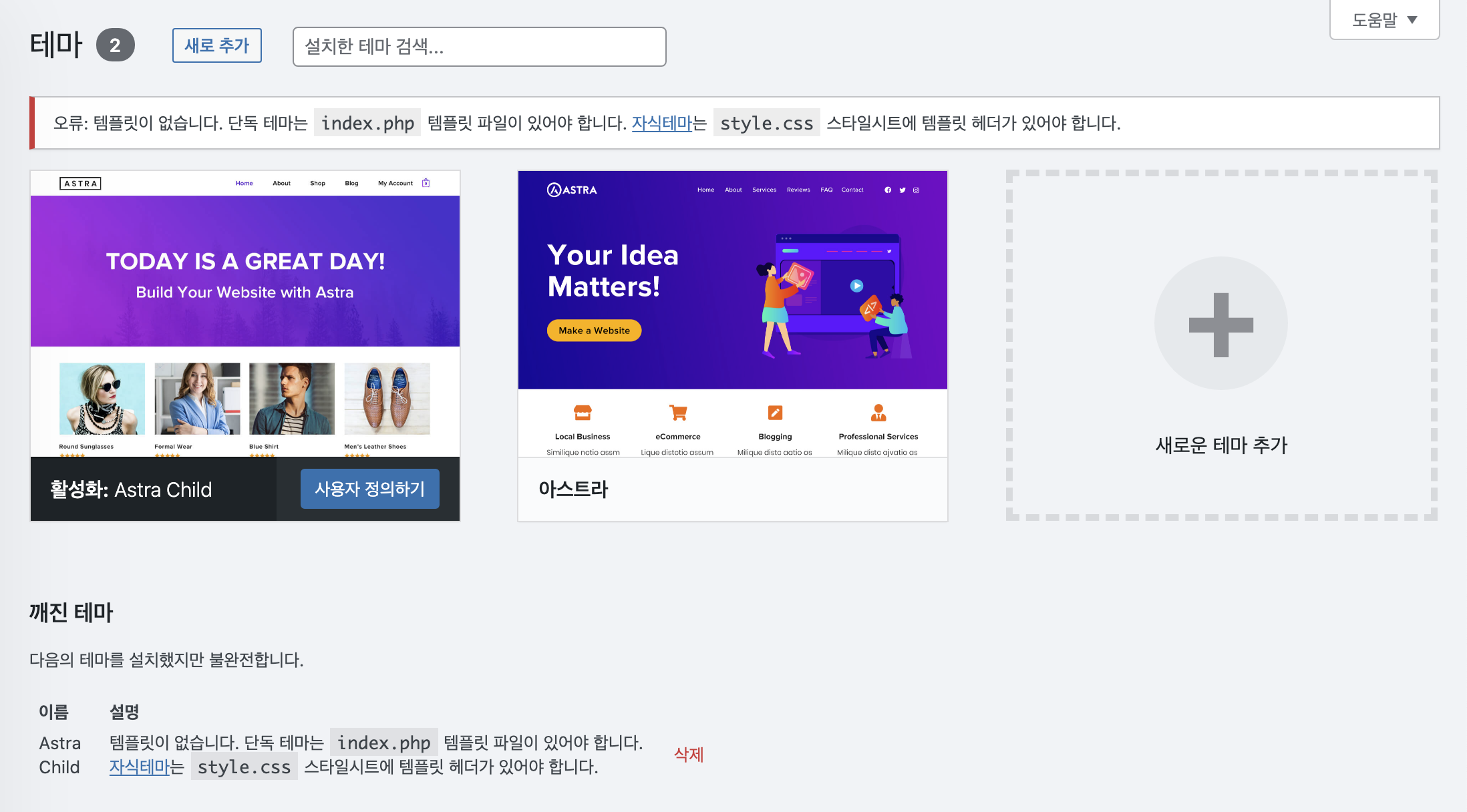 아래 이미지처럼 오류: 템플릿이 없습니다. 단독 테마는 index.php 템플릿 파일이 있어야 합니다. 자식테마는 style.css 스타일 시트에 템플릿 헤더가 있어야 합니다. 오류가 발생하는 경우 style.css 파일에서