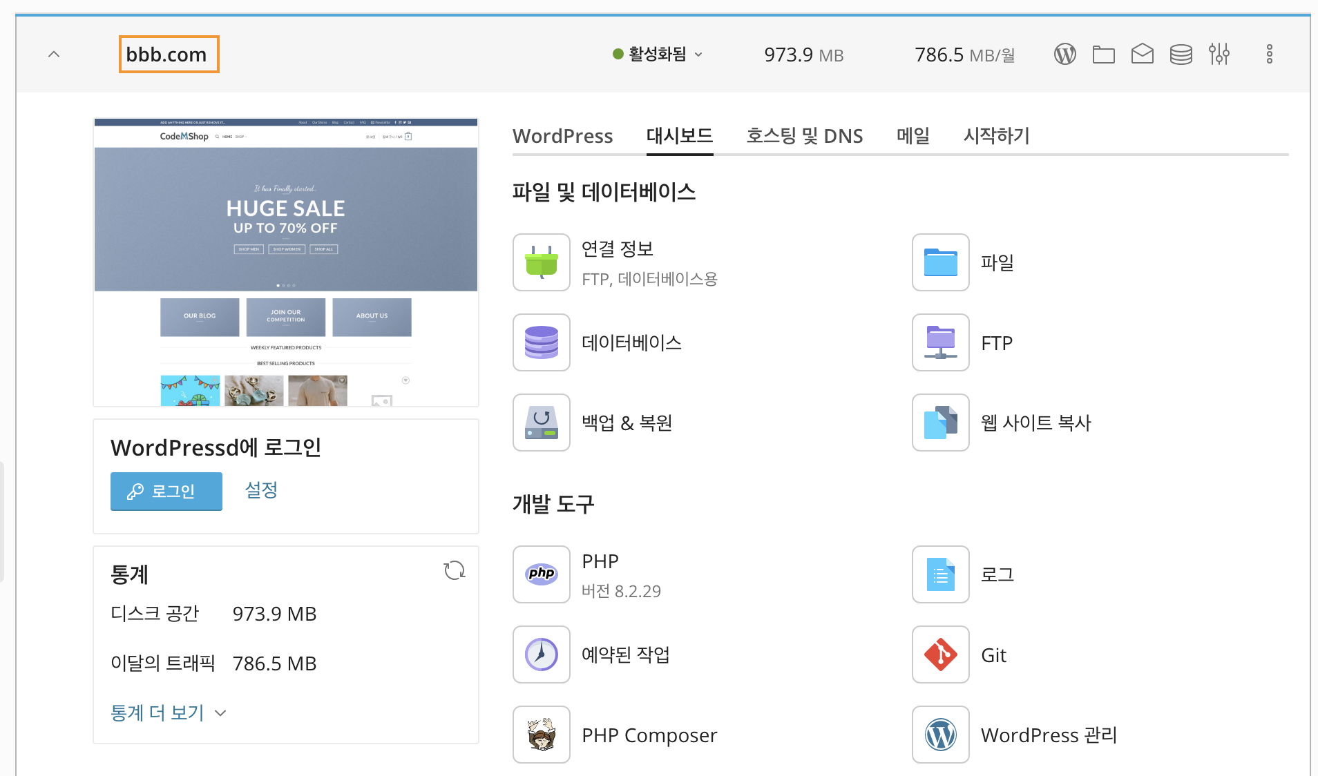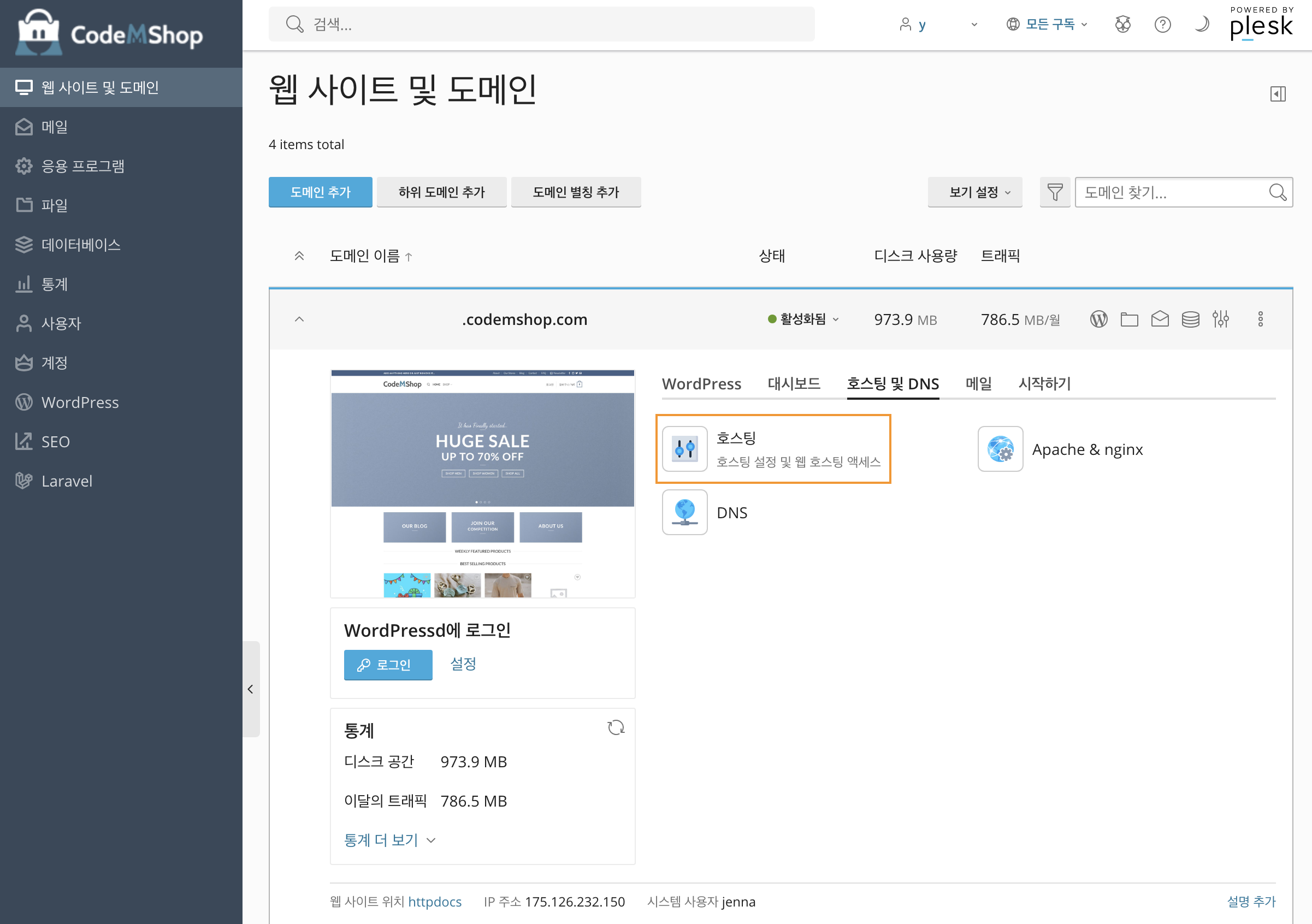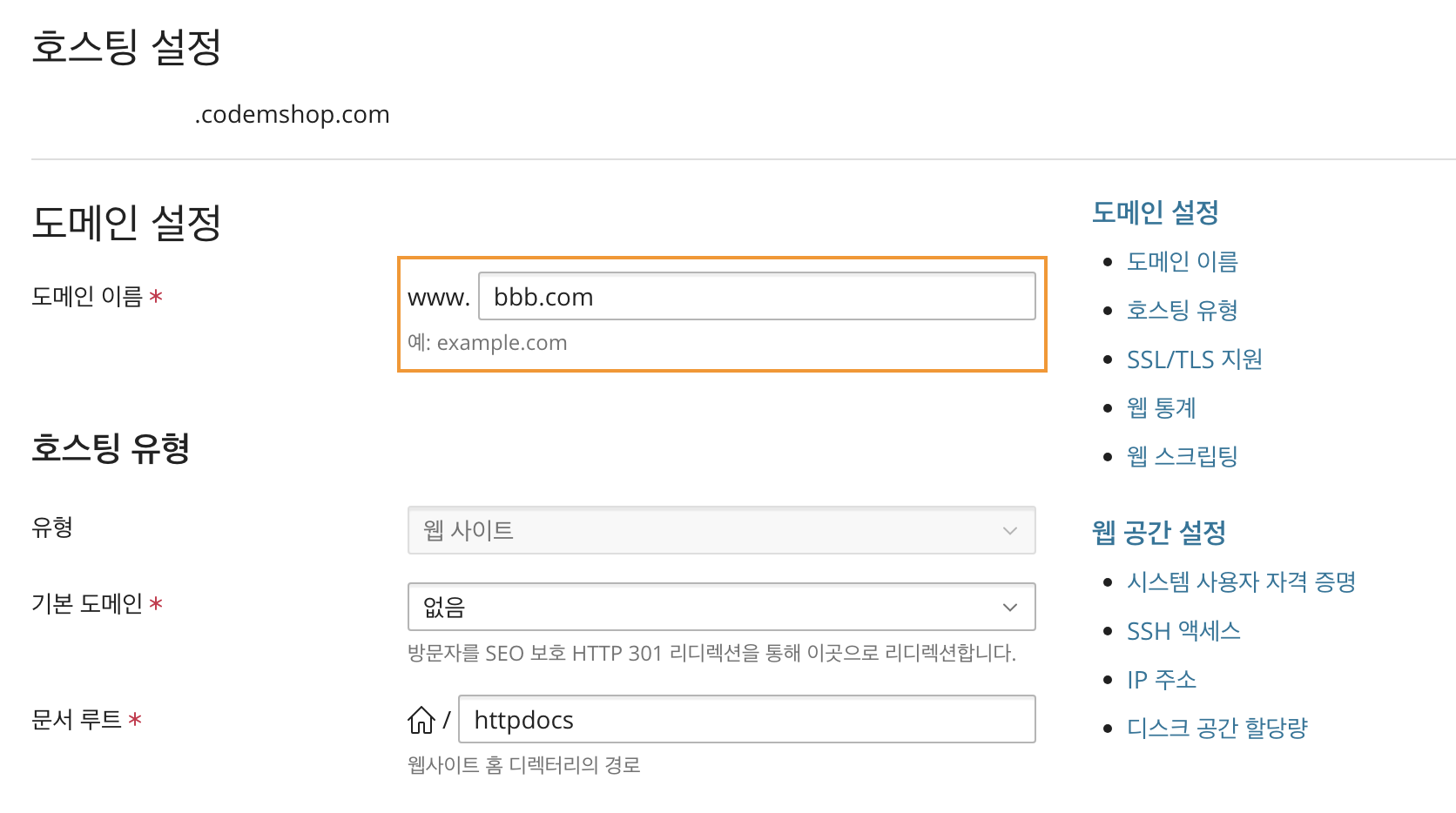 [4] 웹서버 (코드엠에서는 호스팅 관리 패널에서 진행 가능)의 도메인 설정을 변경