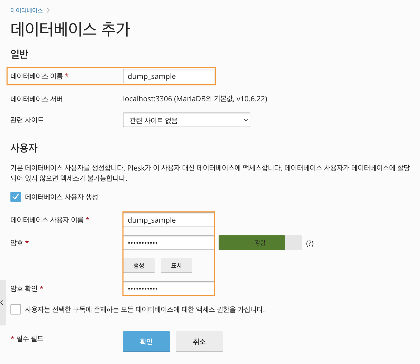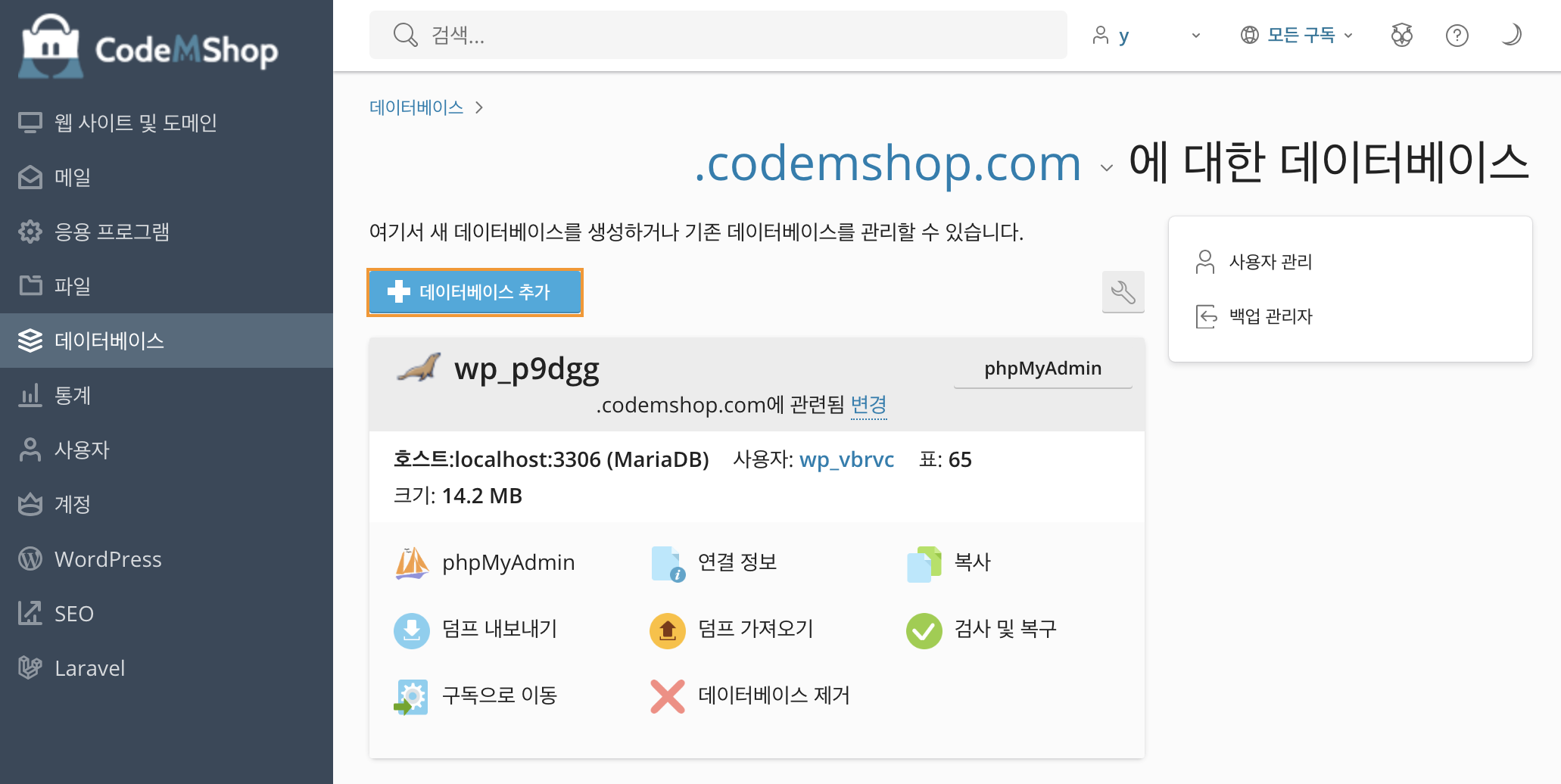 데이터베이스 추가 버튼을 클릭합니다. 데이터베이스 이름, 사용자 이름 등 필요한 정보를 입력한 후 확인을 클릭합니다.