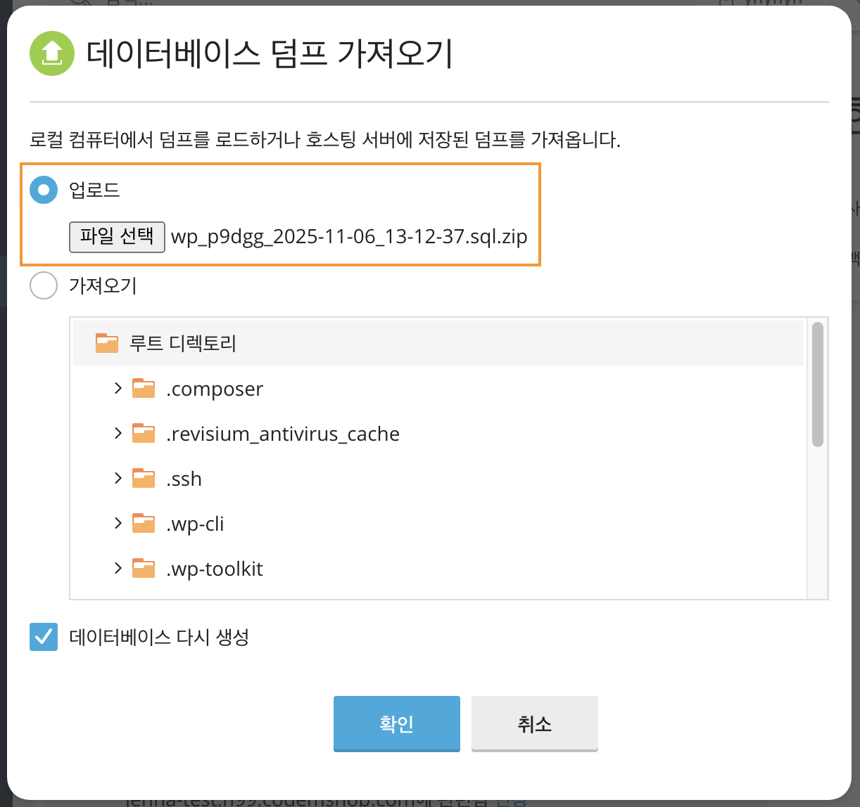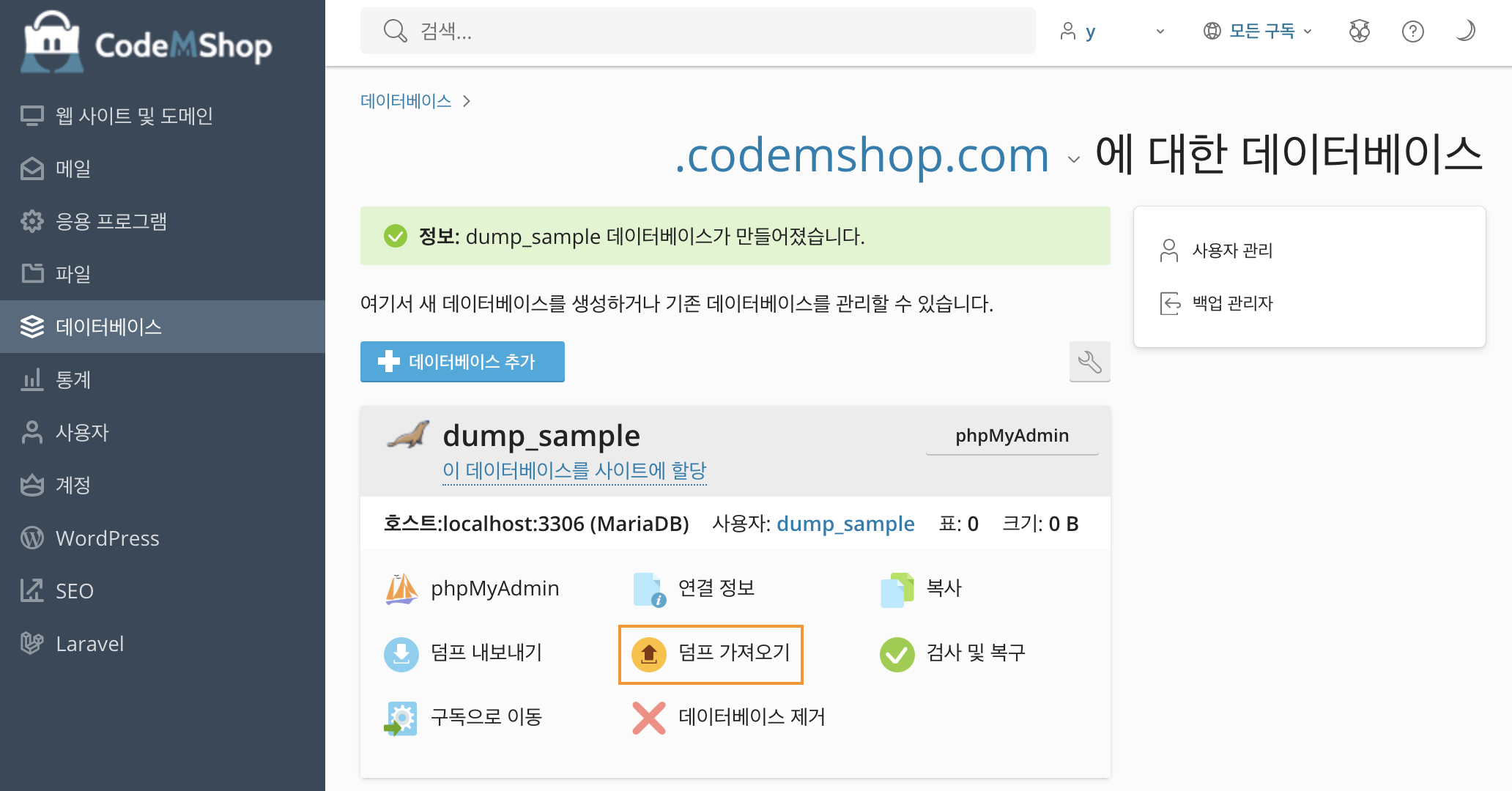새로 생성한 데이터베이스의 덤프 가져오기 버튼을 클릭합니다. 가져올 덤프 파일을 선택한 후, 확인 버튼을 클릭하고 새로고침합니다.