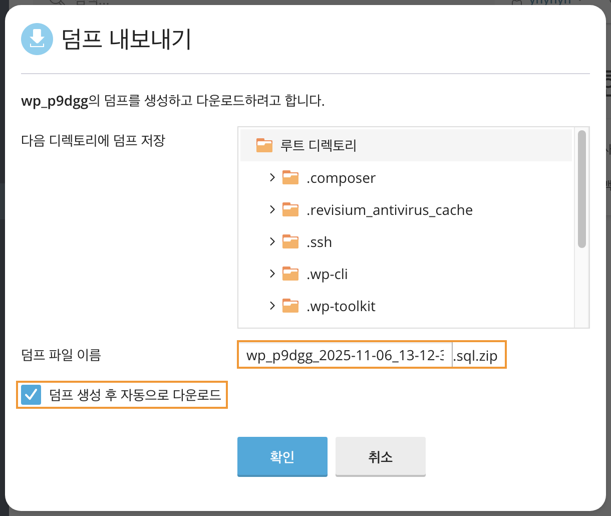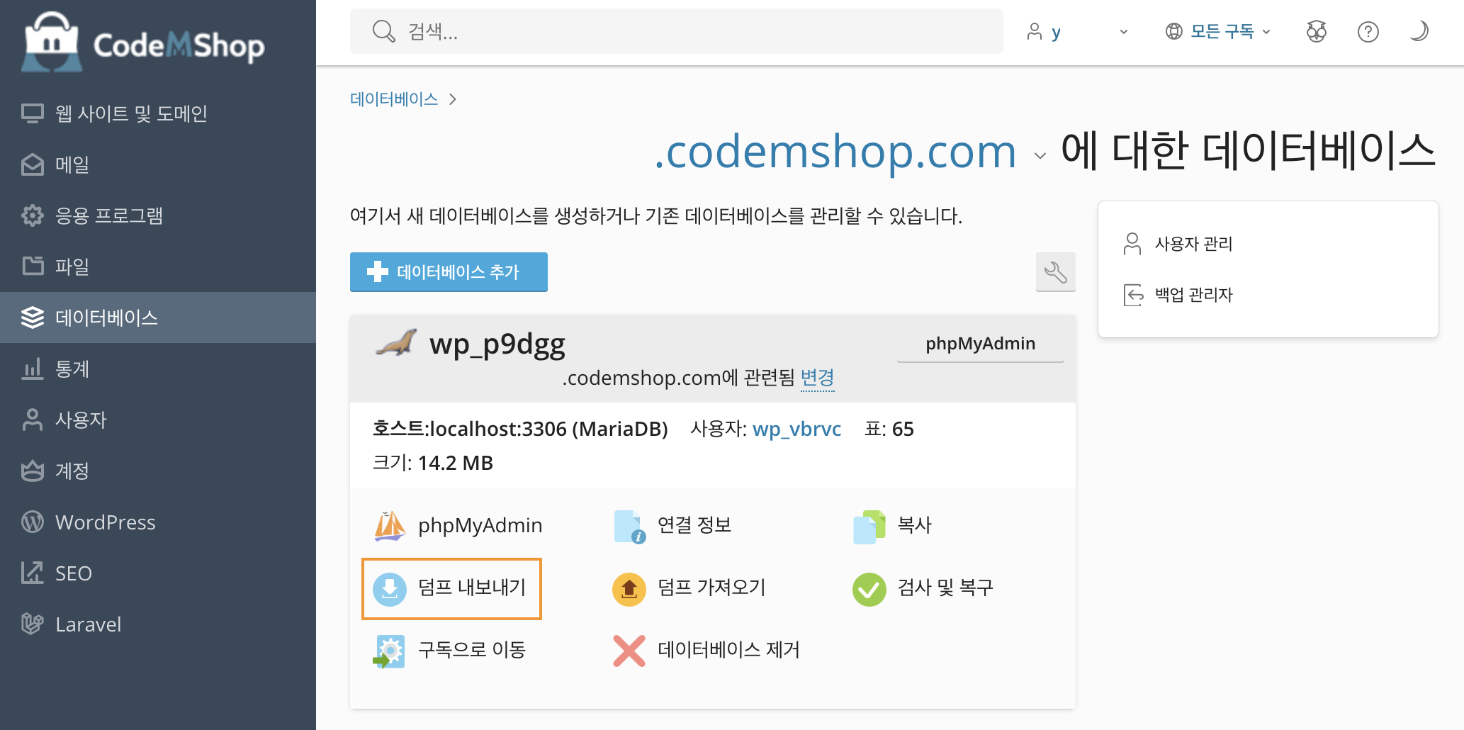 호스팅 관리 패널의 [데이터베이스 > 덤프 내보내기]에서 다운로드할 수 있습니다.