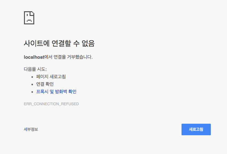 ERR_CONNECTION_REFUSED는 다양한 이유로 발생할 수 있으므로 아래 내용을 참고하여 확인합니다.