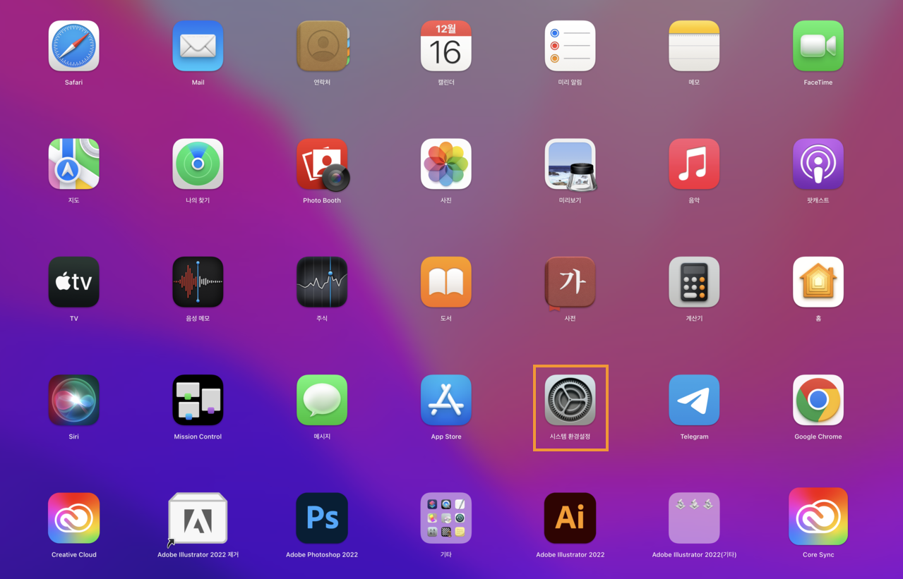 Launchpad에서 시스템 환경 설정 아이콘을 확인할 수 있으며, 시스템 환경 설정을 클릭합니다.