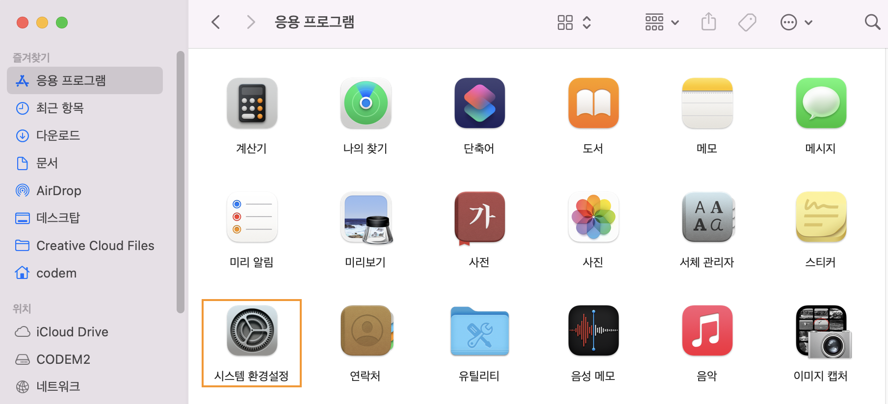 또는 파인더(finder)를 클릭 후, 응용 프로그램에서 시스템 환경설정 아이콘을 확인할 수 있습니다.