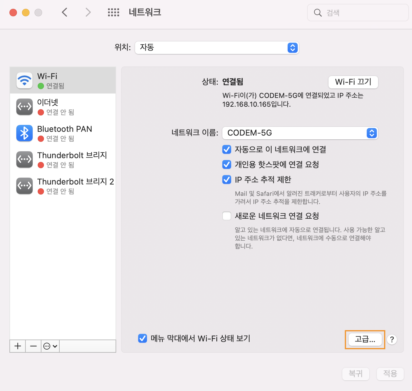 화면 좌측에 현재 연결된 인터넷 수단(무선랜 또는 Ethernet 또는 이더넷)을 선택한 후, 우측의 고급 버튼을 클릭합니다.