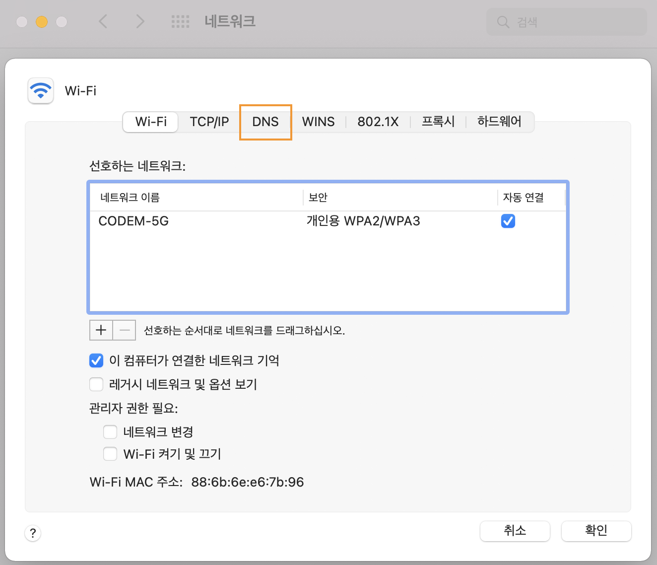 기존 주소가 구글 DNS 주소인지 확인한 후, 아닐 경우 DNS 주소를 선택하여 좌측 하단의 마이너스(-) 버튼을 클릭하여 삭제합니다.