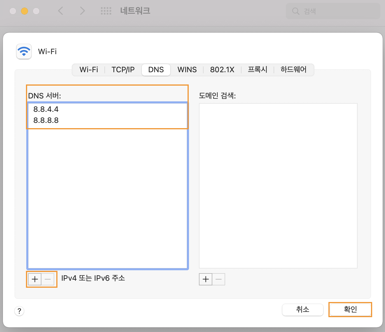 플러스(+) 버튼을 클릭하여 8.8.4.4 / 8.8.8.8을 추가한 후, 우측 하단의 확인 버튼을 클릭합니다.