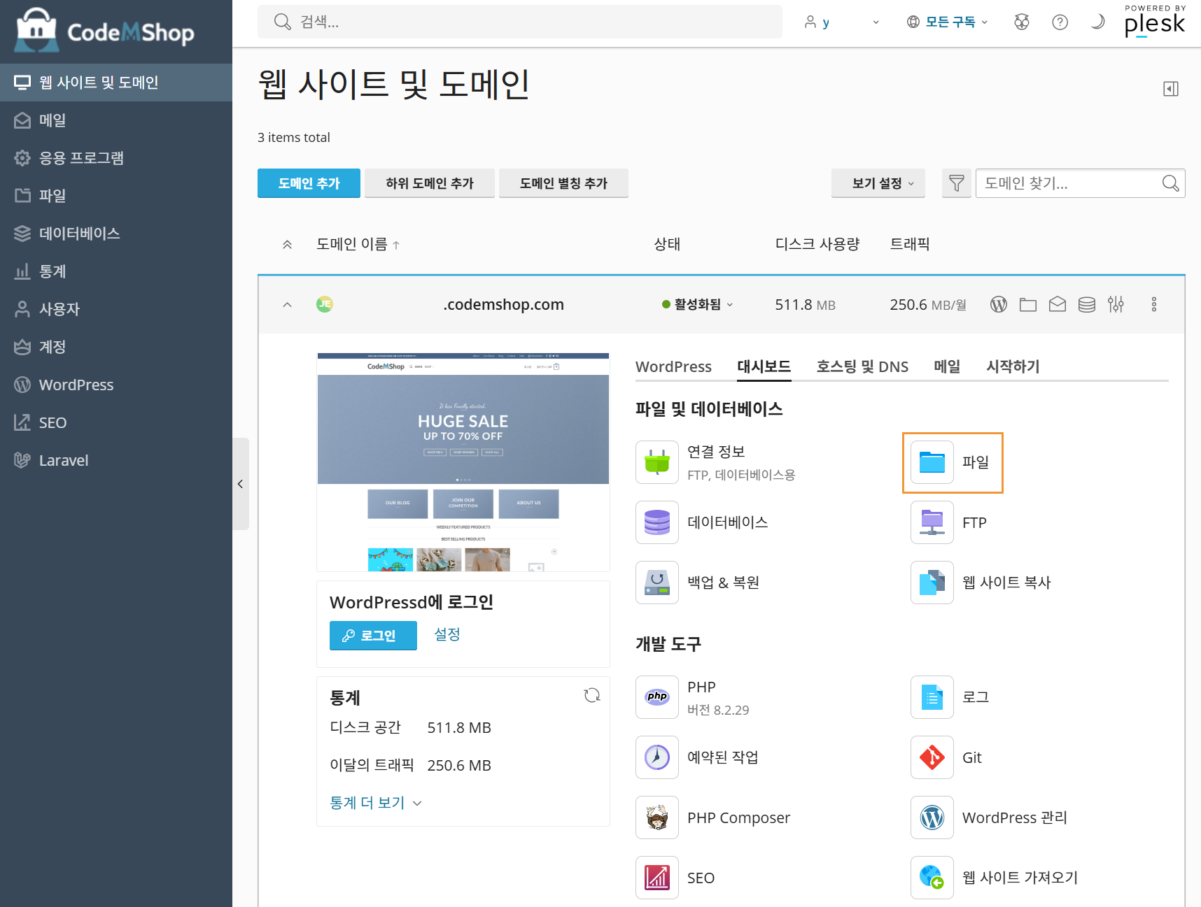 설정 경로는 [웹 사이트 및 도메인 > 대시보드(탭) > 파일] 입니다.