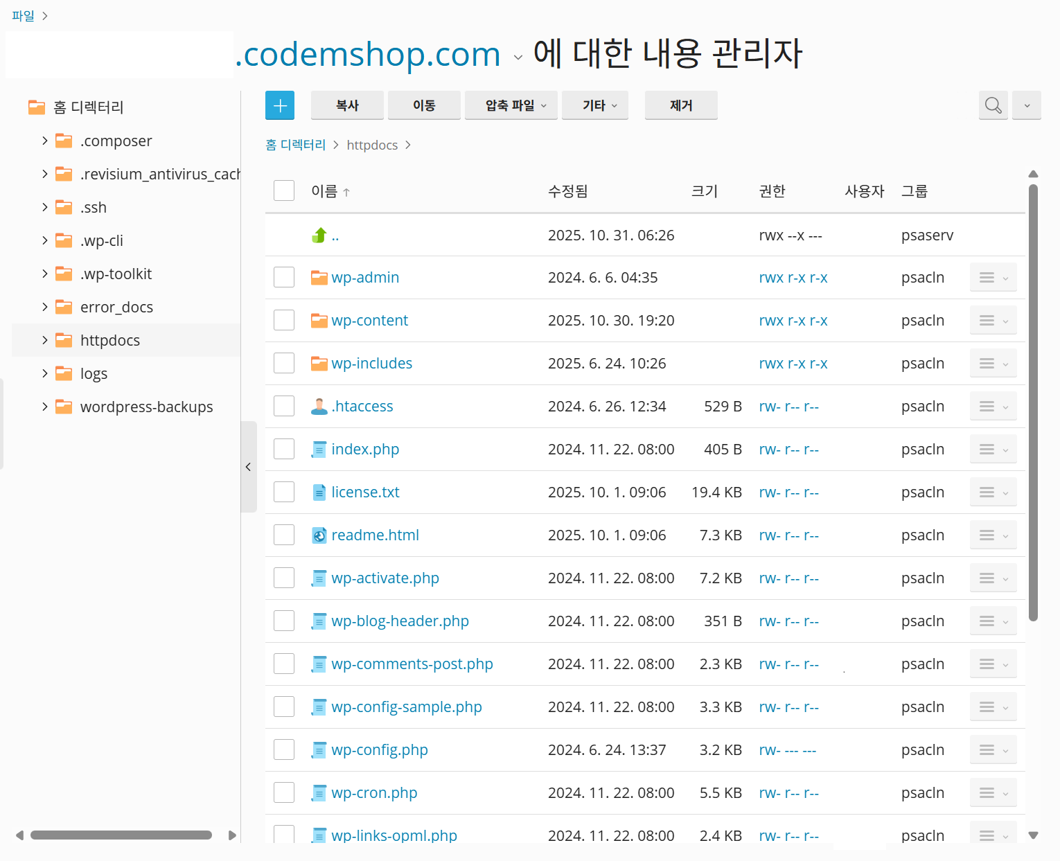 간단한 파일은 이곳에서 FTP 접속 없이 삭제하거나 이동이 가능합니다.
